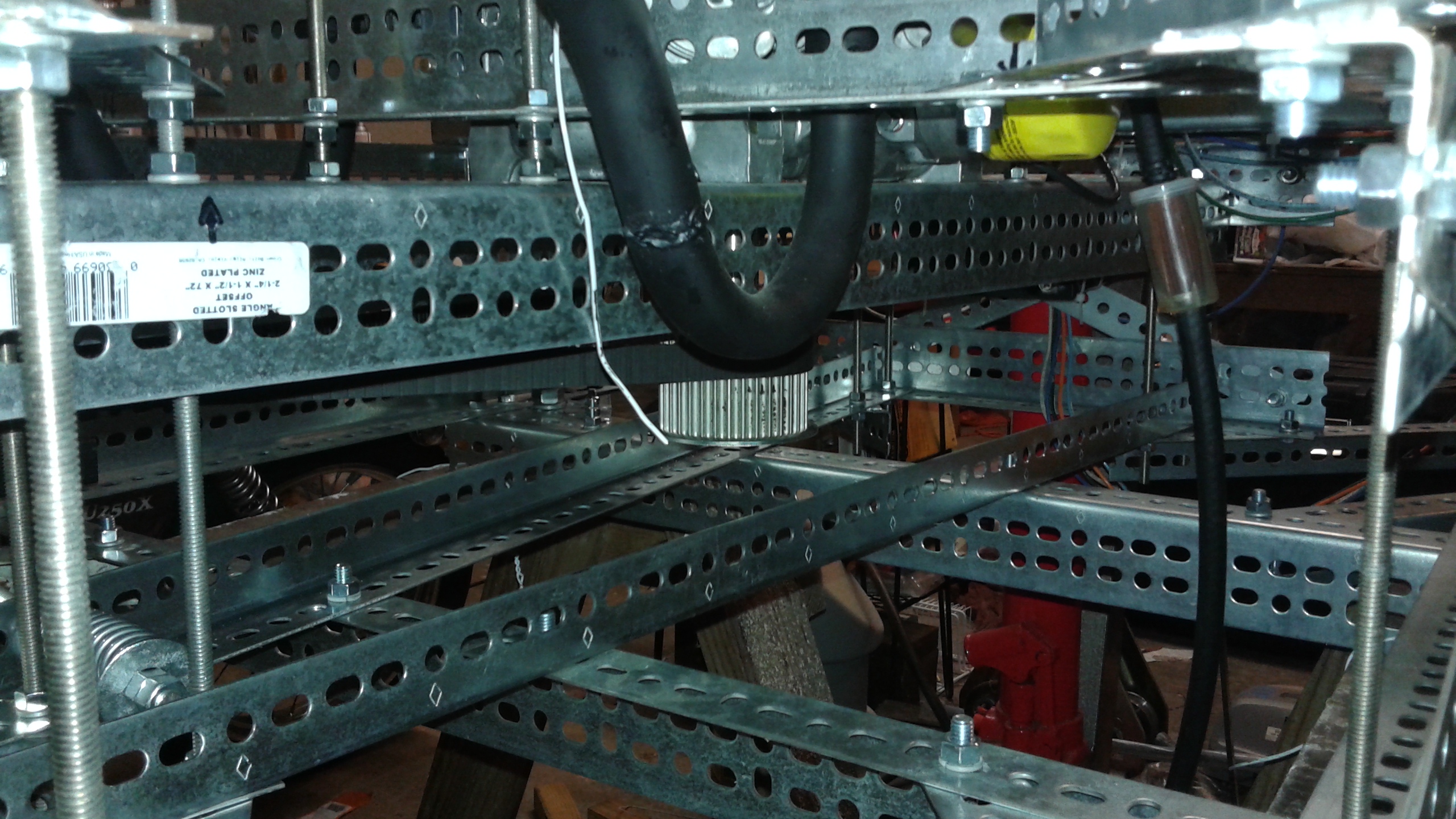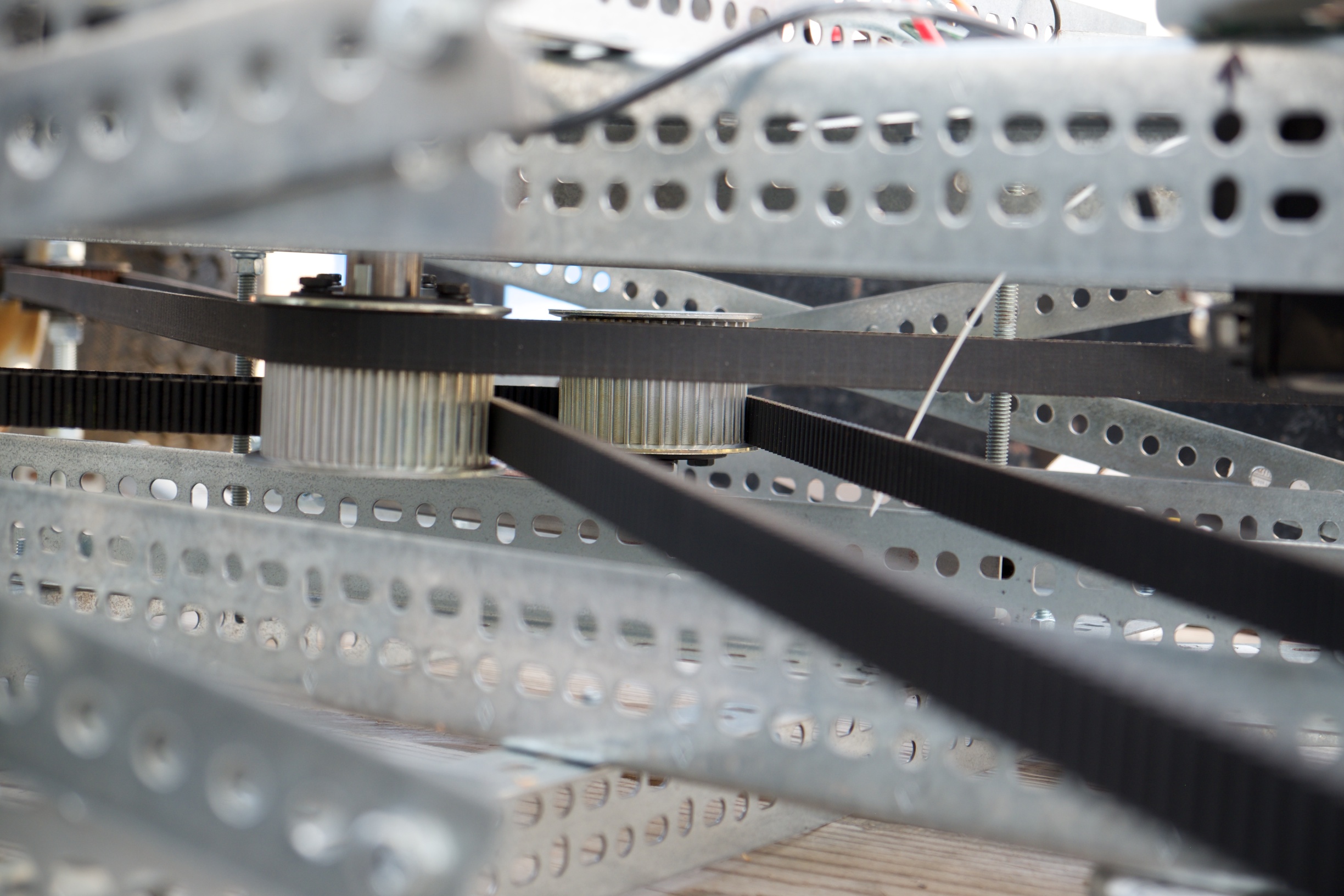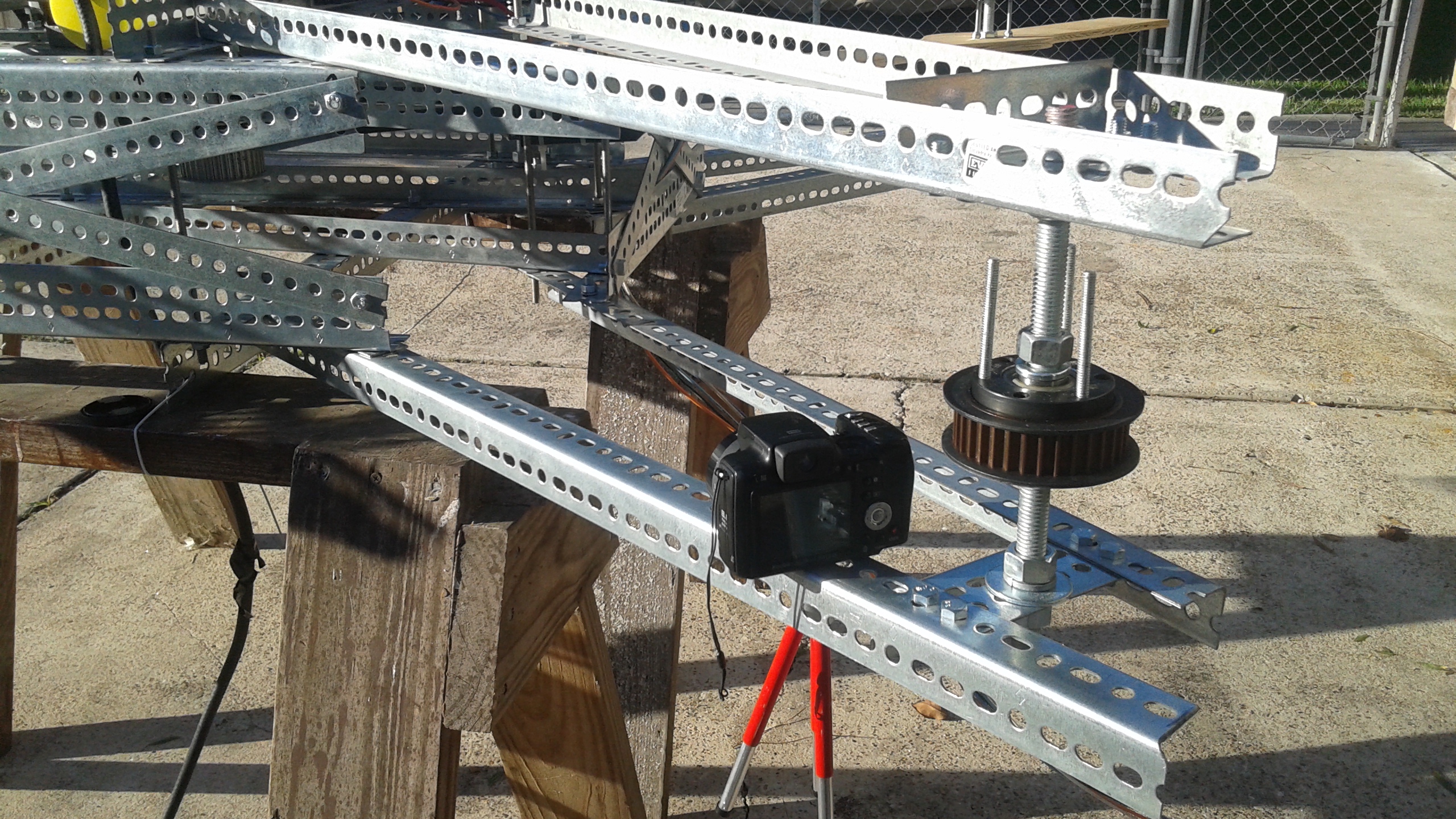 The frame is constructed using slotted galvanized angle, also known as Dexion, bolted together. While this is heavier than a steel tube or composite frame, the dexion is quickly assembled and can easily be reconfigured. At a later stage when the configuration is finalized the dexion could be swapped out for a lighter weight frame.