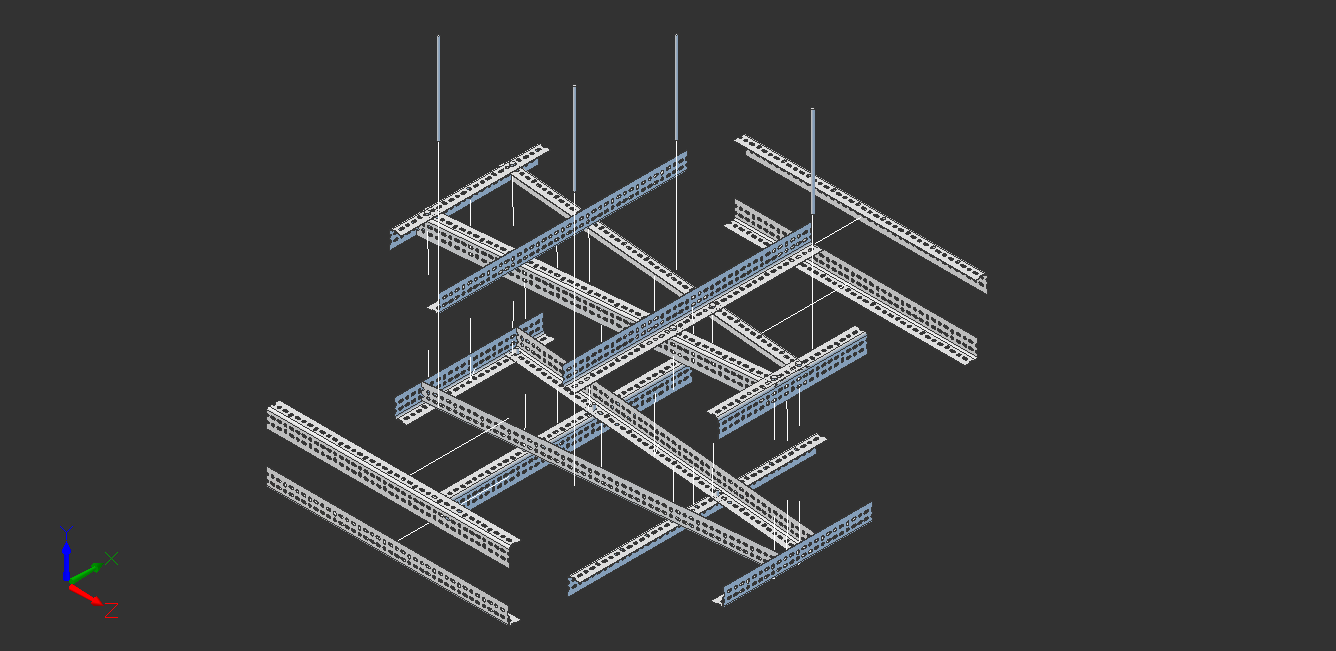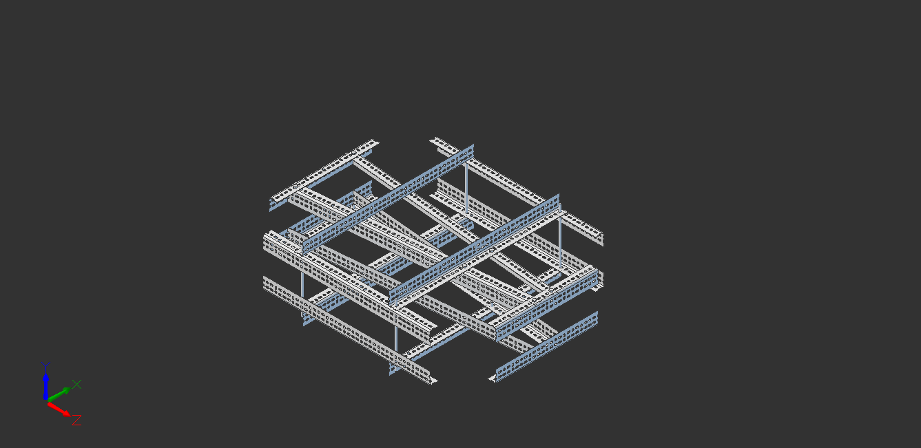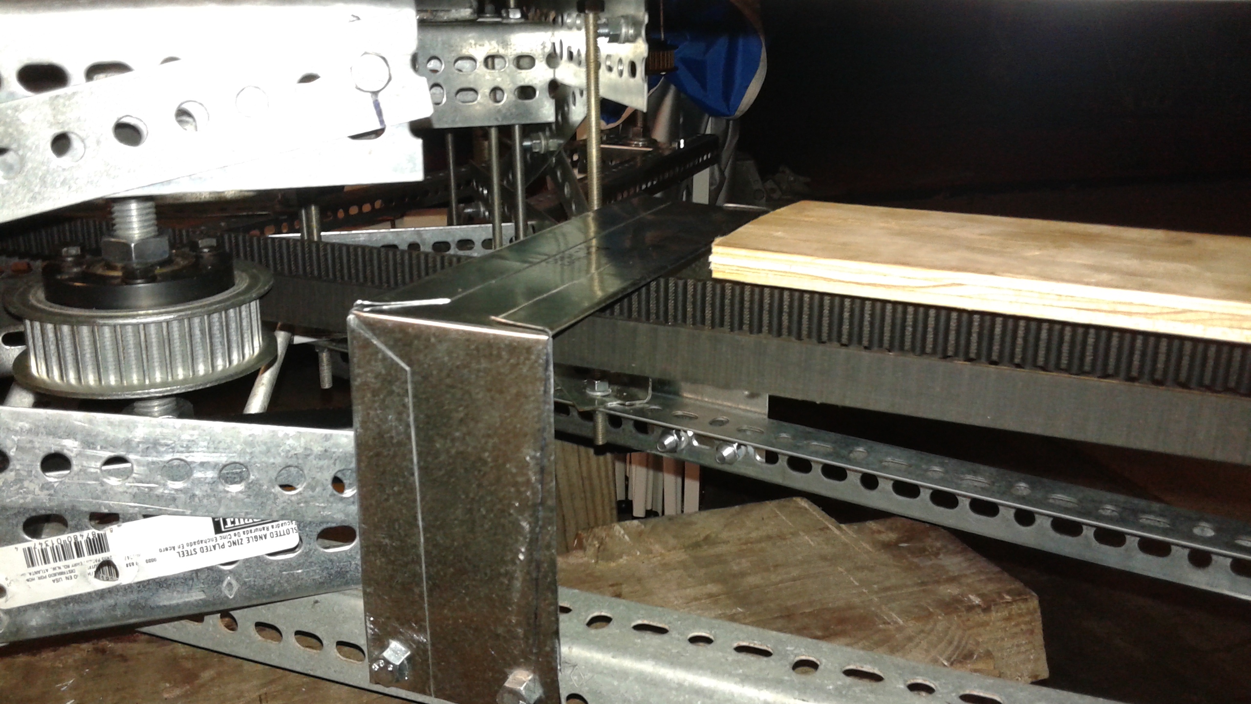 The frame is constructed using slotted galvanized angle, also known as Dexion, bolted together. While this is heavier than a steel tube or composite frame, the dexion is quickly assembled and can easily be reconfigured. At a later stage when the configuration is finalized the dexion could be swapped out for a lighter weight frame.