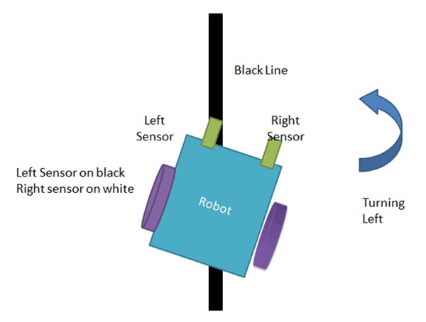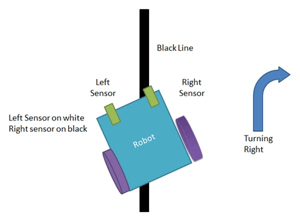 If right sensor sense black line then robot turn right side until both sensor comes at white surface. When white surface comes robot starts moving on forward again.