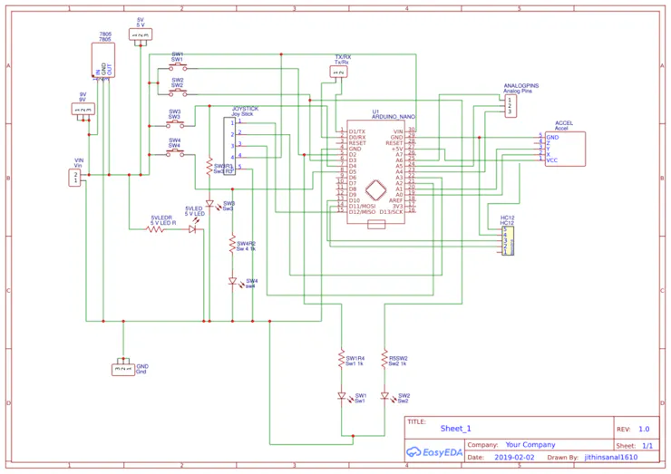 I drew a circuit in EasyEDA which included all the components on the breadboard – the joystick, accelerometer, Arduino Nano and HC12 module and 4 buttons which are connected to the digital pin of the Arduino. These buttons will be useful in the future.