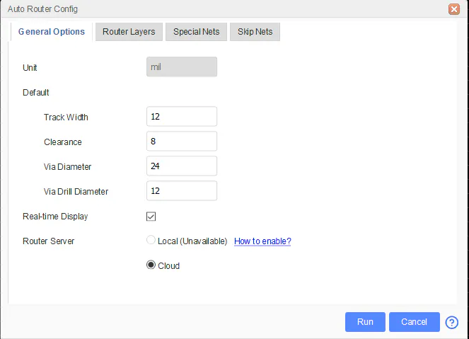 This will open up an Auto Router Config Page where you can provide details such as clearance, track width, layer information etc. Once you have done that, click on “Run”.