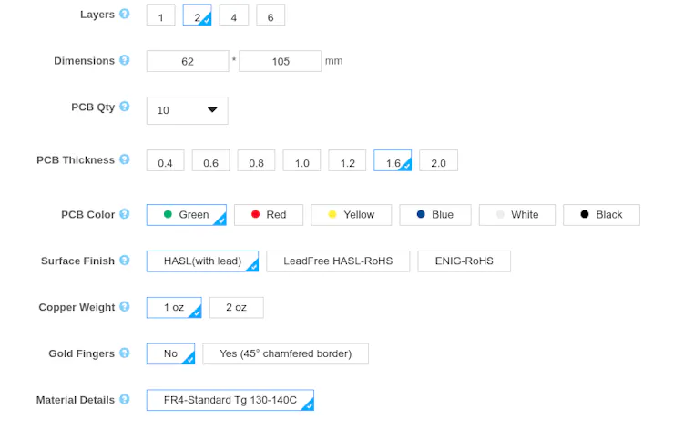 Below the PCB preview, you will see so many options such as PCB Quantity, Texture, Thickness, Color etc. Choose all that are necessary for you.
