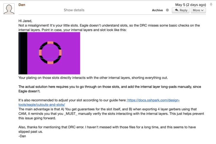 I went to check the unpopulated boards and low and behold: shorted. So, in a moment of desperation I reached out to Dan at OSH Park. He got back to me relatively quickly with the answer: slots.