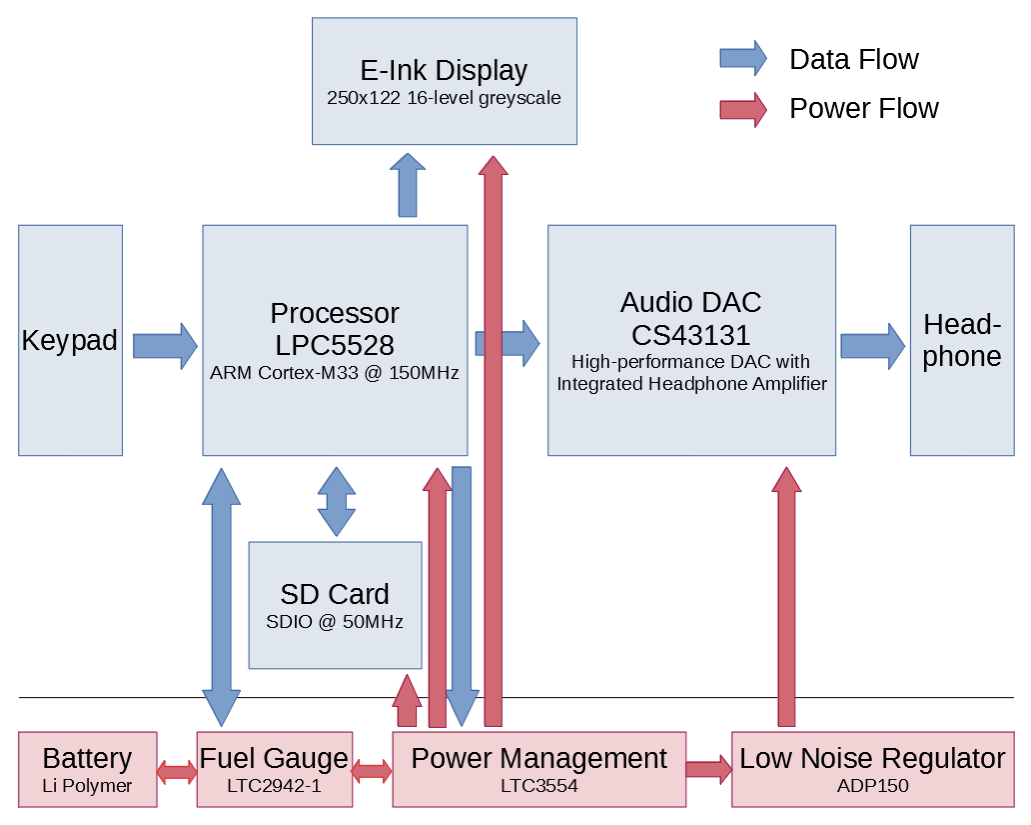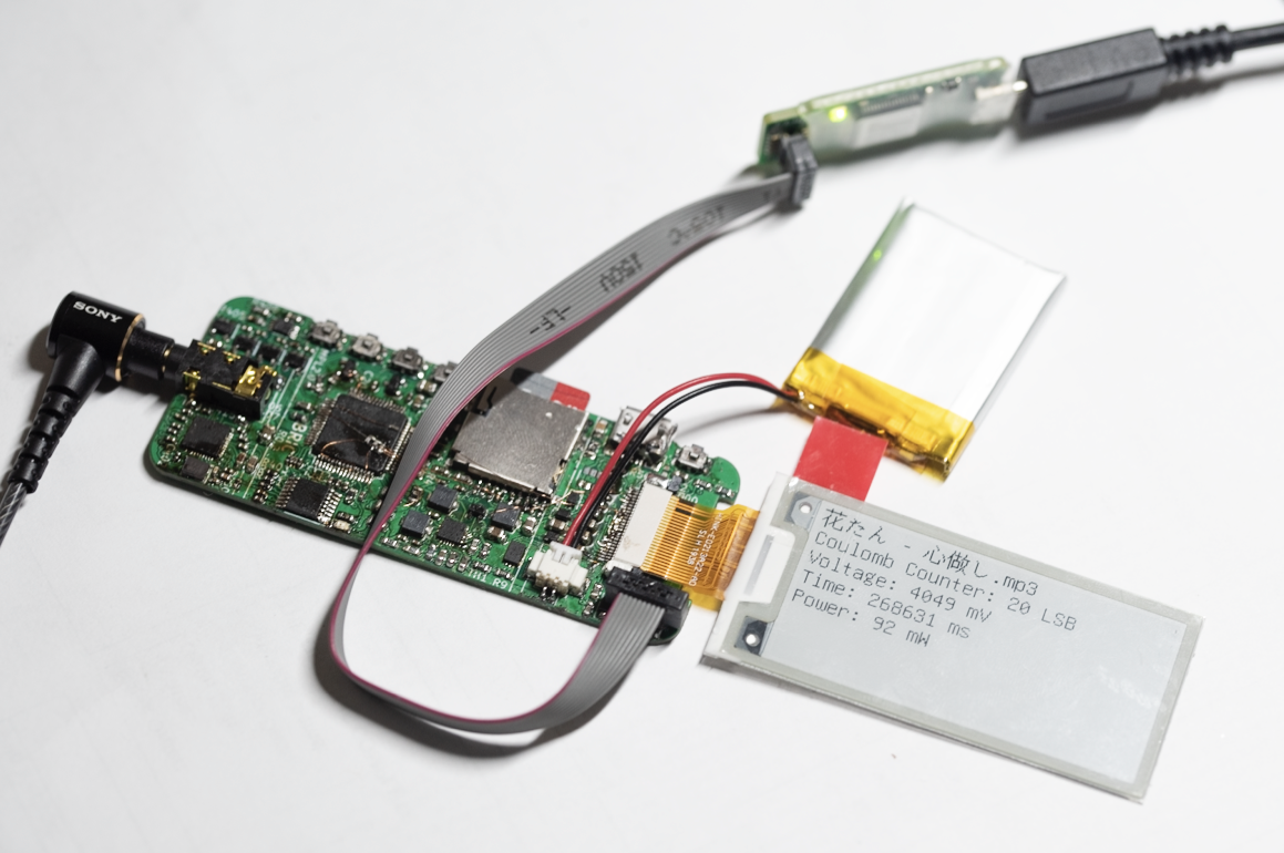 The main processor being used is the NXP LPC5528 microcontroller. It is an ARM Cortex-M33F based microcontroller manufactured at the latest (as of 2020) 40nm eNVM process. It has a hardware single-precision floating-point unit, which would allow running floating-point DSP algorithms much faster. It has 256KB of internal RAM and 512KB of internal flash. The DAC being used is the Cirrus Logic CS43131 DAC. It is a high-performance audio DAC with an internal charge pump and headphone driver. Integrated solutions allow us to make the device smaller. The screen is the GoodDisplay GDEH0213B72, which is a 2.13” E-ink display with a resolution of 250x122. Additionally, ADI LTC3554 and ADI ADP150 are being used for voltage regulating and charge control, regulating the power. For precise estimation of the remaining battery capacity, a fuel gauge (LTC2942-1) is also used onboard, providing tracking for the total energy used. This can be also useful for measuring power consumption.