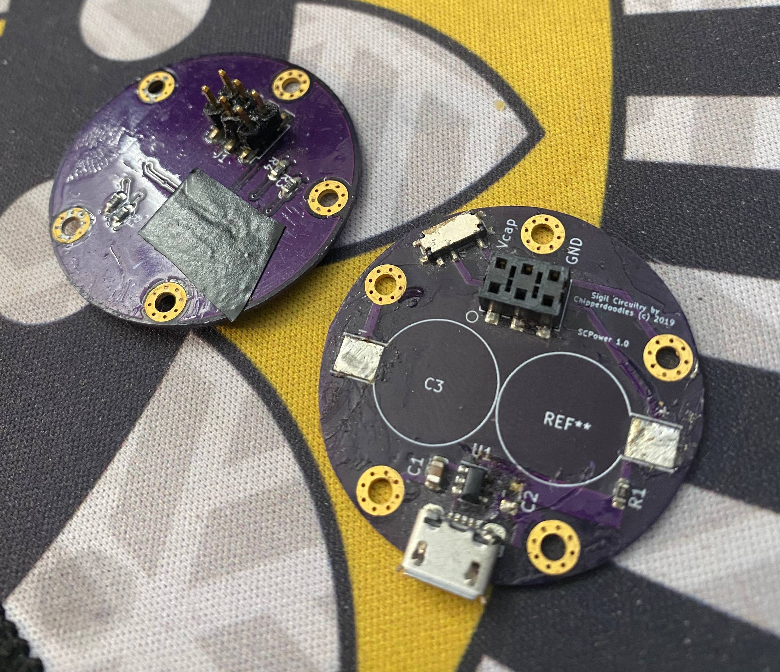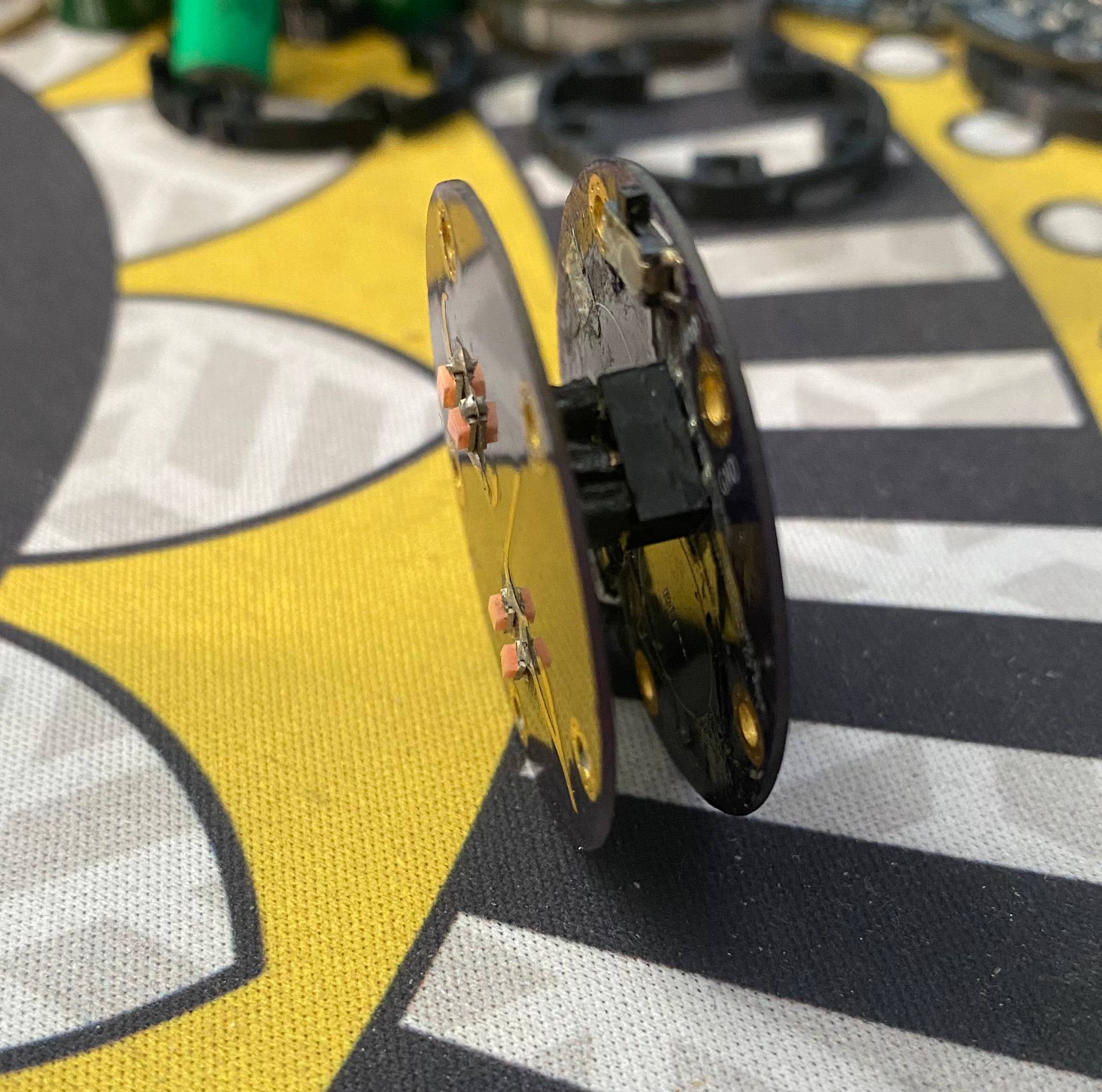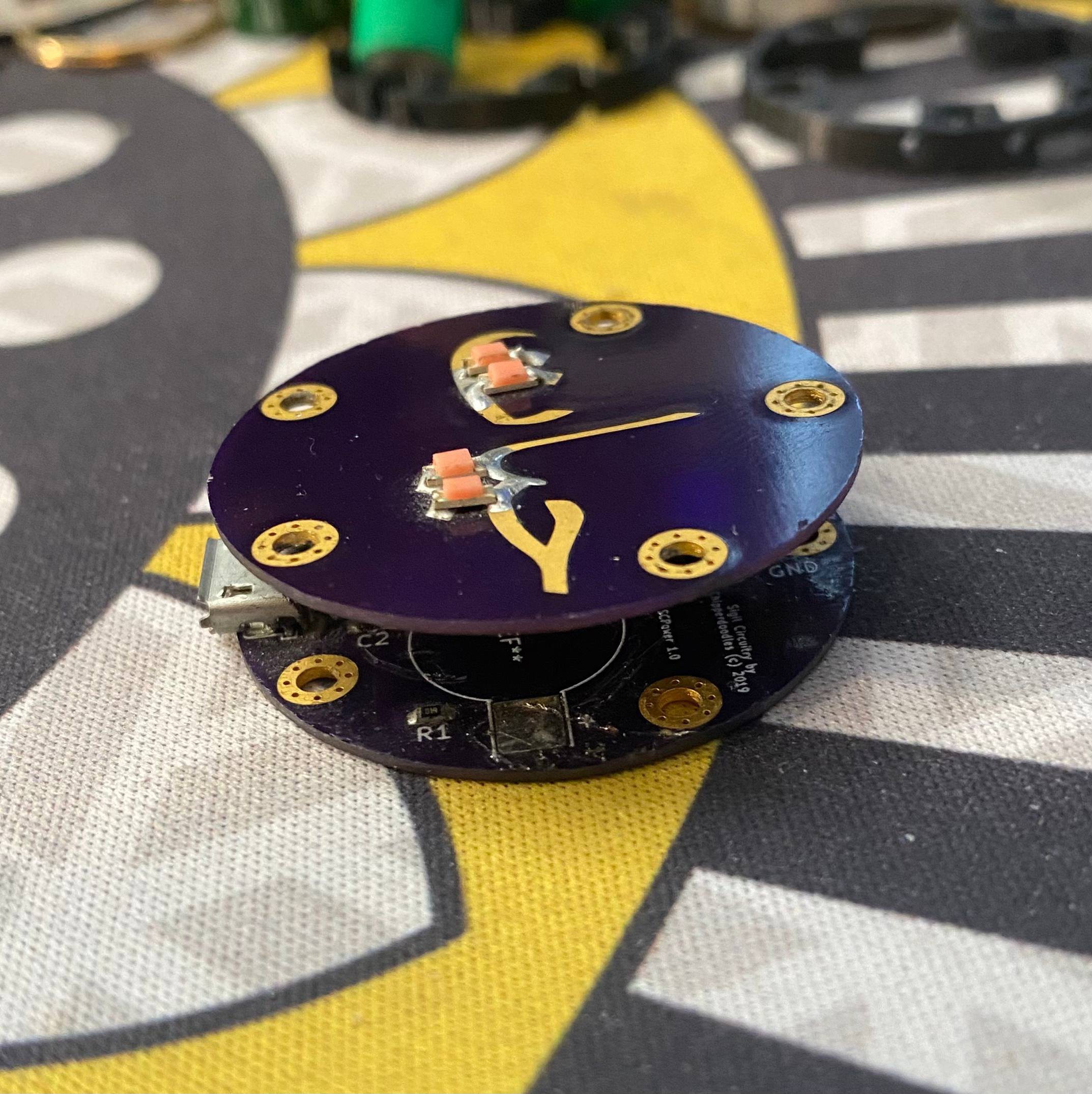So with sails unfurled I start designing my next amulet. I tried to find the lowest profile SMD that would be easy to solder and settled on a 6 pin 2.54mm header. Also while working on this version I decided to experiment with overall height I tested out using 0.8mm for both base board and face plate pcb thickness.