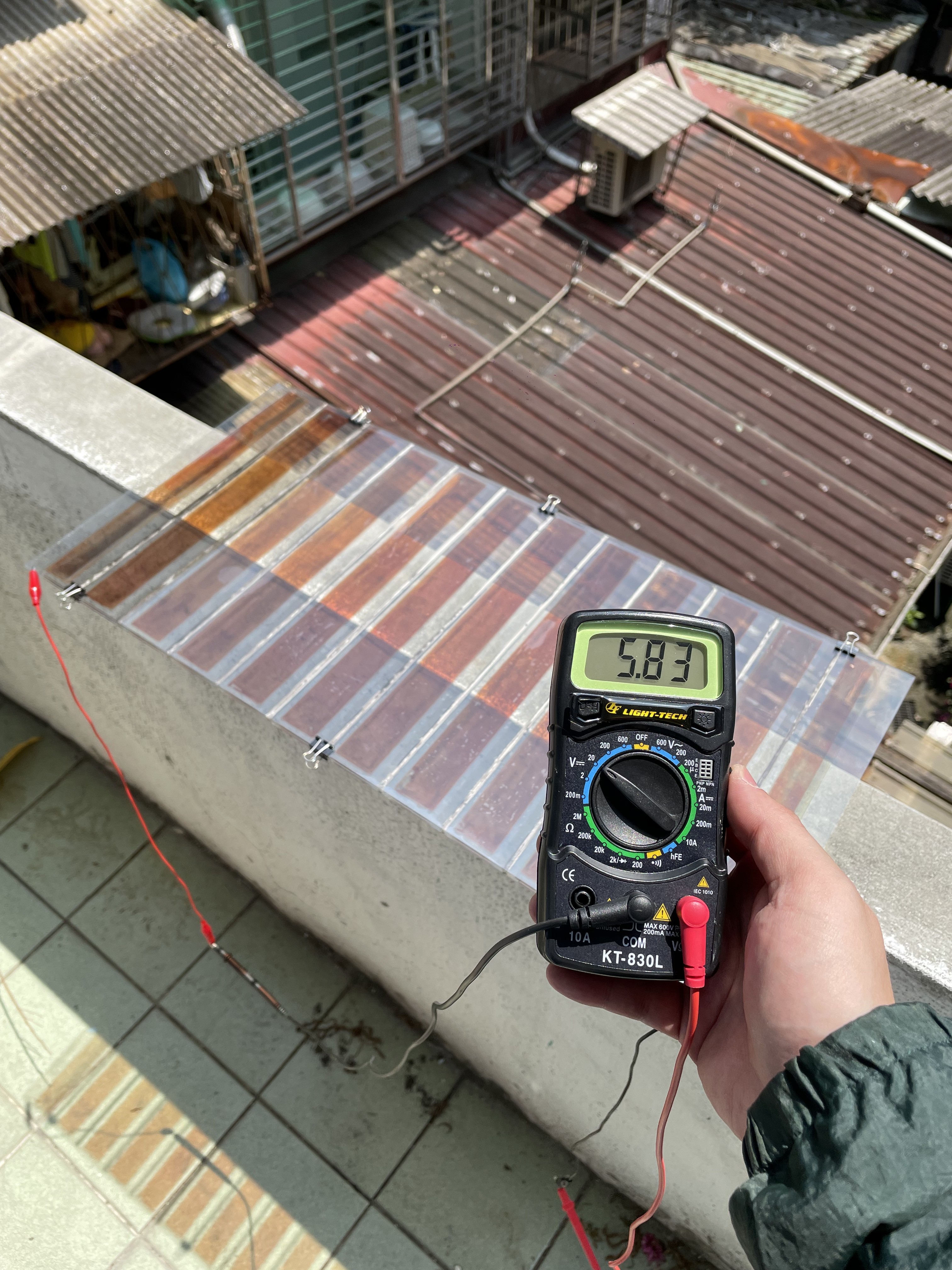 This measurement did not take the participation of the solar simulator but only with nature sunlight at noon in Taiwan. The open circuit voltage and open circuit current are measured as 5.8V and 51mA respectively.