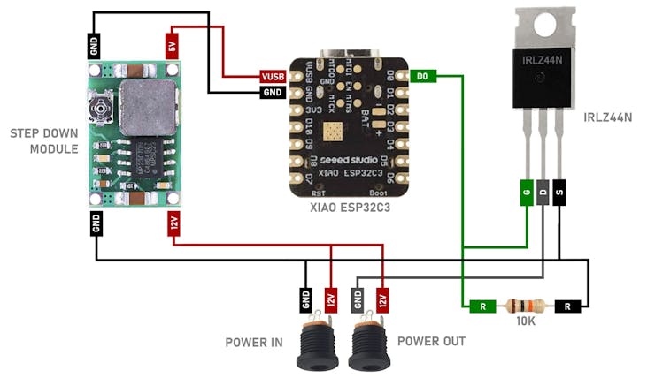 Before assembling we need to preset the voltage on the step-down converter Connect your 12v source into IN+ and IN- and set the voltage to 5v. measure it from the OUT+ and OUT-- using a multimeter. it is used to provide the necessary 5v to XIAO ESP32C3
