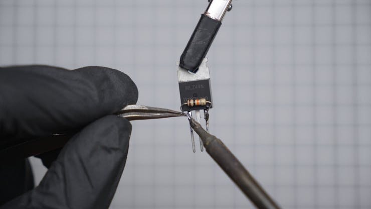 We can start the assembly by soldering a 10k resistor between G and S of the MOSFET