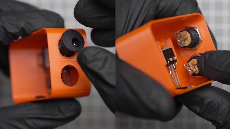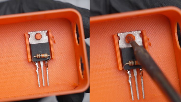 Now place the MOSFET into the 3D printed slot and melt the tab using a soldering iron to fix the MOSFET in place.