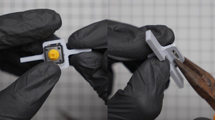 Put the push button in the button holder and bend the 4 terminals into the 3d print using a nose player