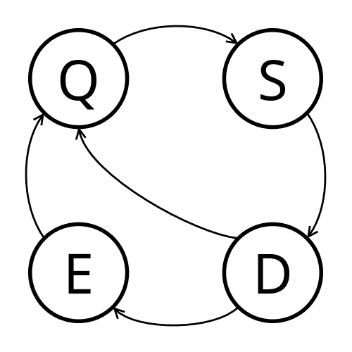 It takes only 2 bits, the FSM diagram is pretty simple and not very subtle: the states Q-S-D-E occur in sequence (though E can be skipped during normal operation).