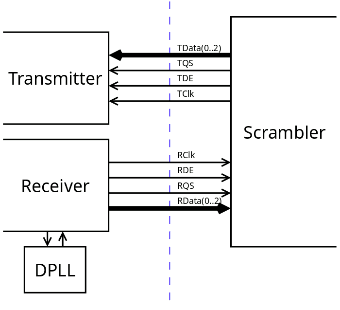 This simplified MAC-PHY interface can work on-chip or off-chip. And for dual-lane configurations, a second PHY is used: the scrambler must manage the alignment and splitting of the words into correct-sized nibble.