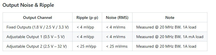 - Fixed outputs: 3.3 V, 2.5 V, 1.8 V (up to 3 A each)