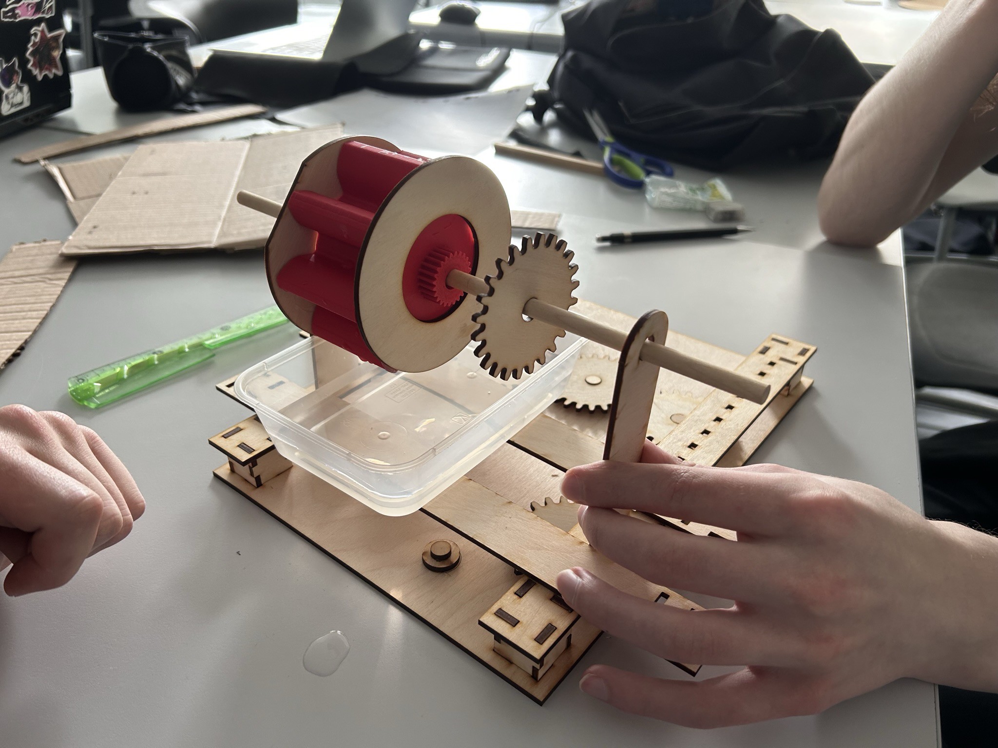 In the end this V2 version if more efficient than the one we made before, and it work with water ! However the new wheel catch a bit to well the water so each time we used it there was always water everywhere 😂