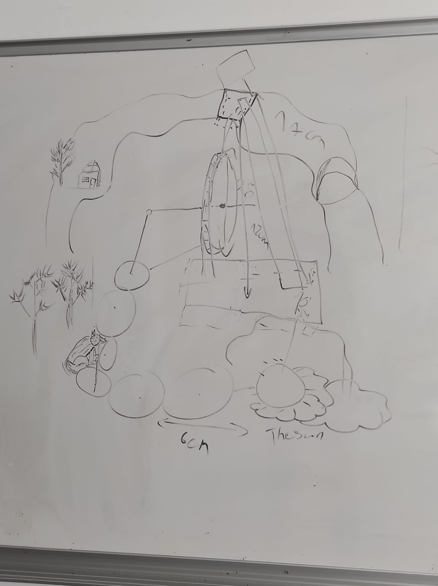 After that we made a little assembly with a bucket to stocked water and showed to the teachers that our water wheel worked :