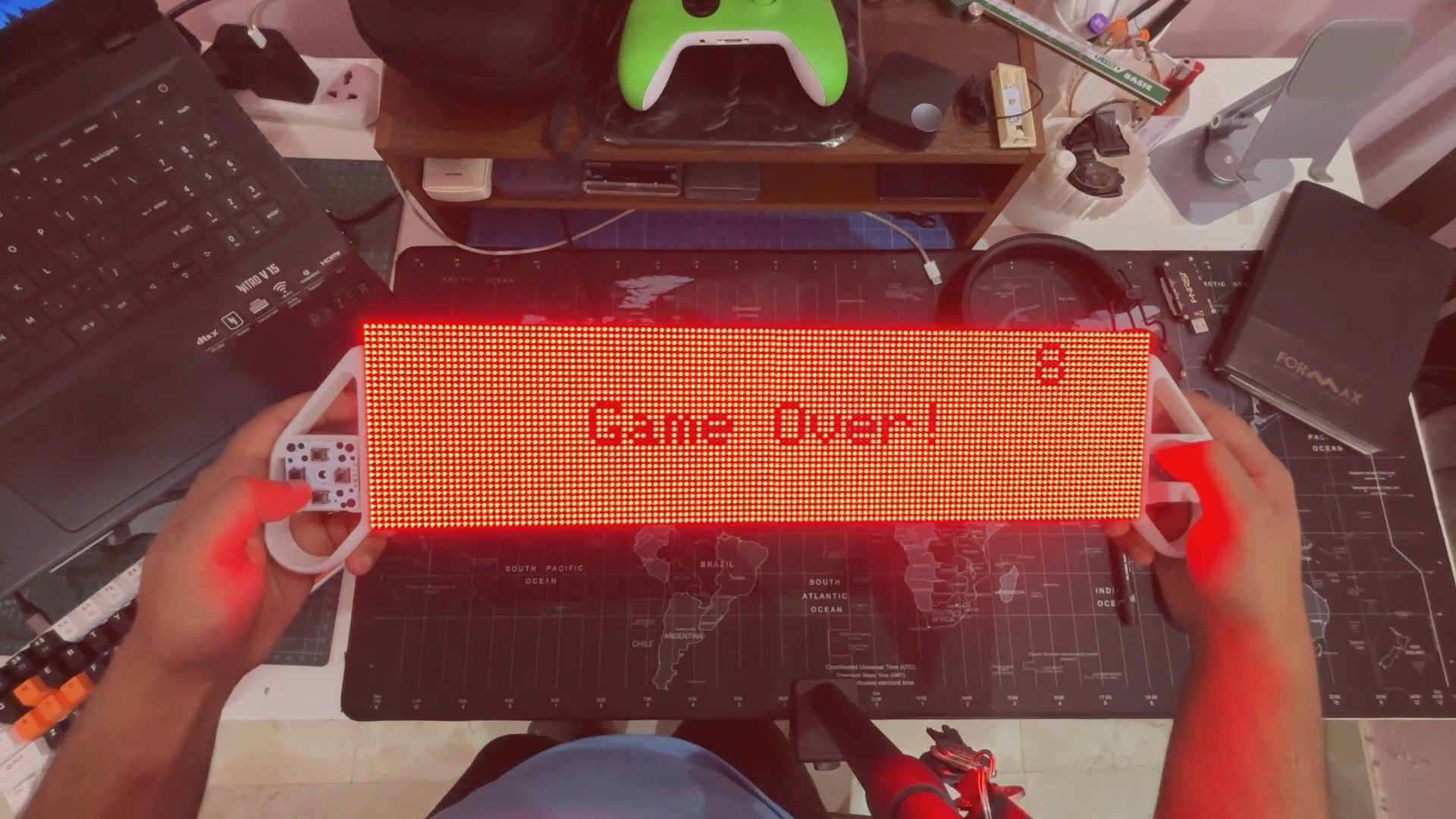 The first step in developing the Snake Game Console MAX was to create an updated 3D model of the housing to suit the improved dual-display setup. The new version combines two 64×32 P3 RGB LED matrix panels into a seamless 128×32 display, resulting in an even wider playfield.