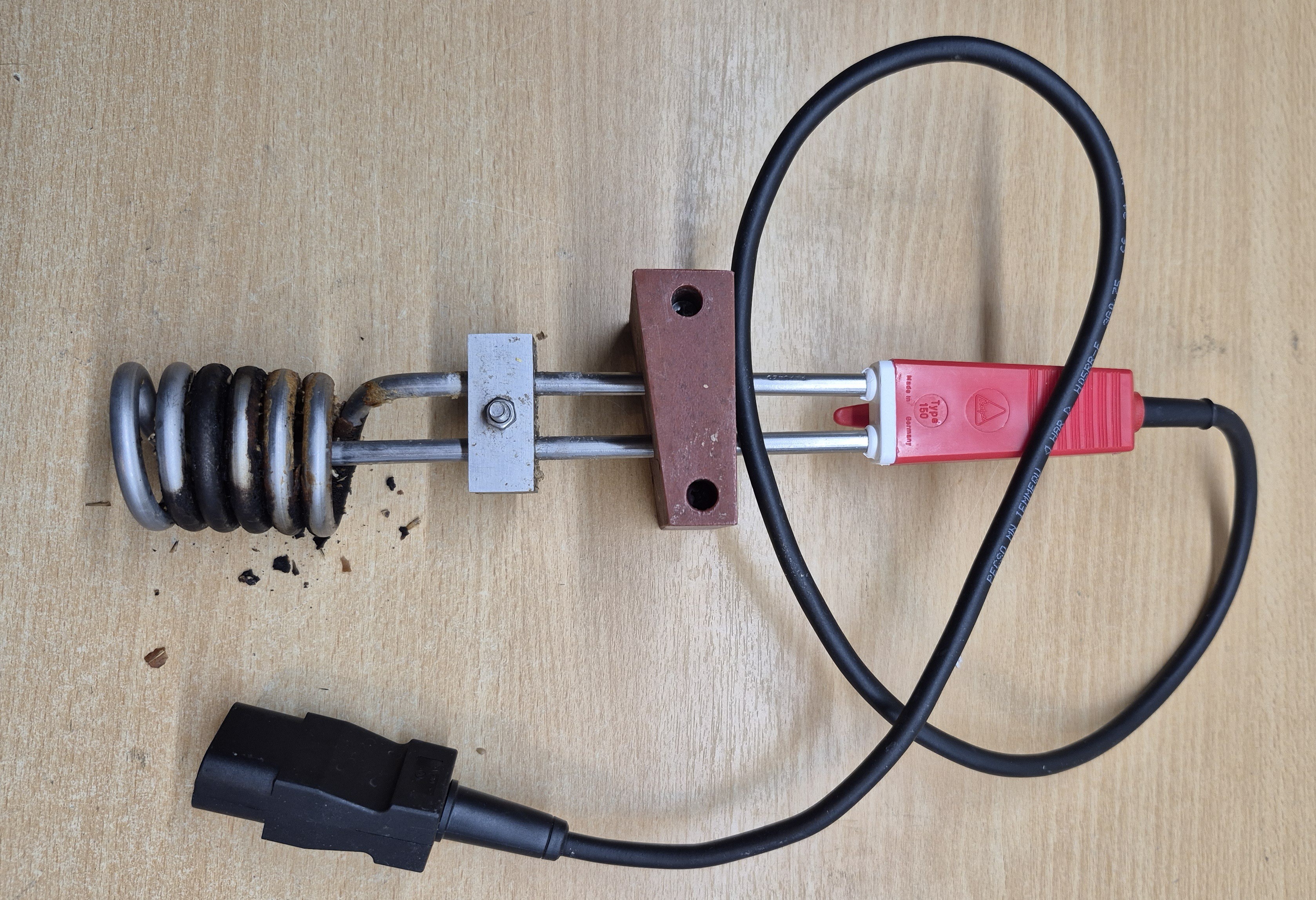 Next, I switched to a cheap 1500W immersion heater—a simple spiral-type element. Temperature regulation was excellent: I could keep the heater at 100% power right up to 1°C below the target without overshooting. But eventually, grain clogged the spiral, which led to burned grain.