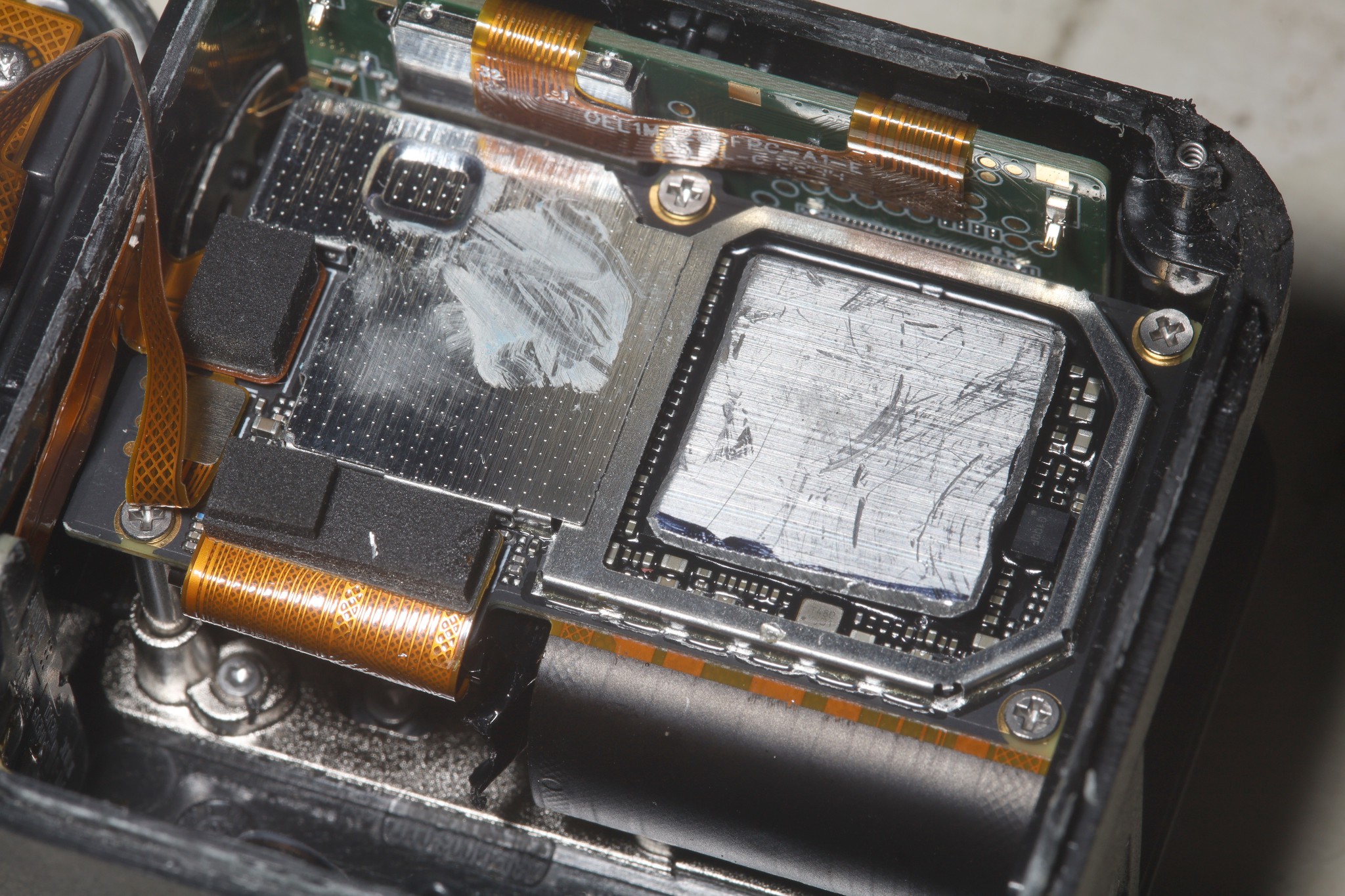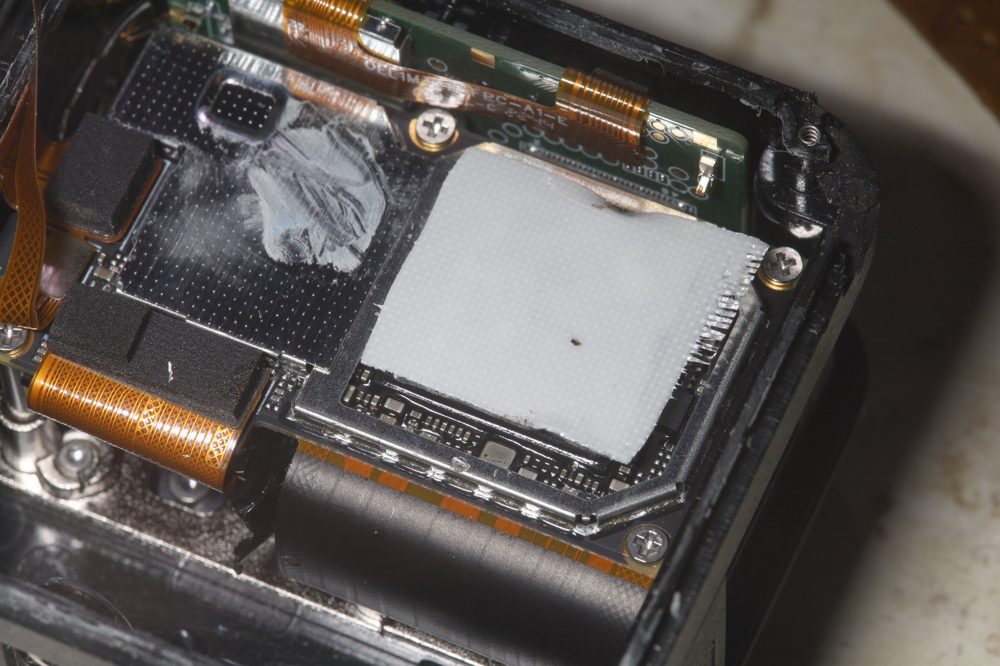 The gap between the CPU & the heat sink came in at 1.25mm. It was spanned by 5 layers of thermal tape. This gooey compliant mechanism held the heat sink in pretty securely while not transferring vibration.