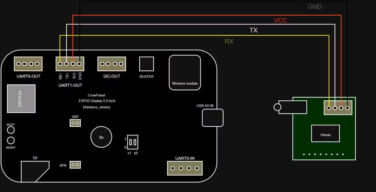 So we paired the CrowPanel Advance 5.0 HMI (ESP32-S3, Arduino/LVGL) for the interface with our GRC TinyTTS Kit built on the Himax HX6538 (Cortex-M55 + Ethos-U55) for synthesis. The difference was instant: no more playback — the device was speaking.