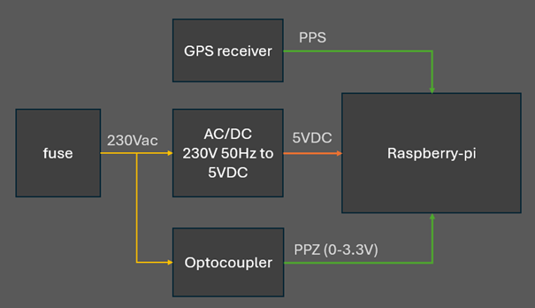 The goal: measure the local 50 Hz mains frequency in near real time, using a Raspberry Pi, a zero-crossing detector, and the pigpio library for precise timing. The Pi counts the signal edges, keeps timestamps in a circular buffer, corrects time drift using a 1 Hz PPS reference from a GPS receiver, and streams the calculated frequency over WebSocket.
