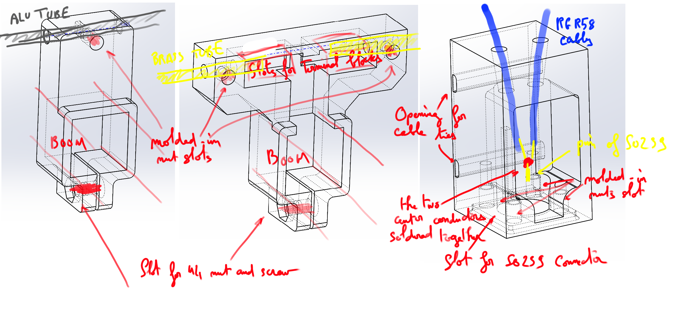 From left to right: passive element holder, driven element holder, and the "case" used to secure and protect the SO239 connector.