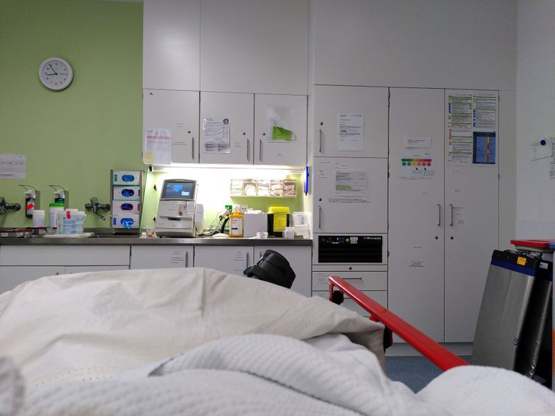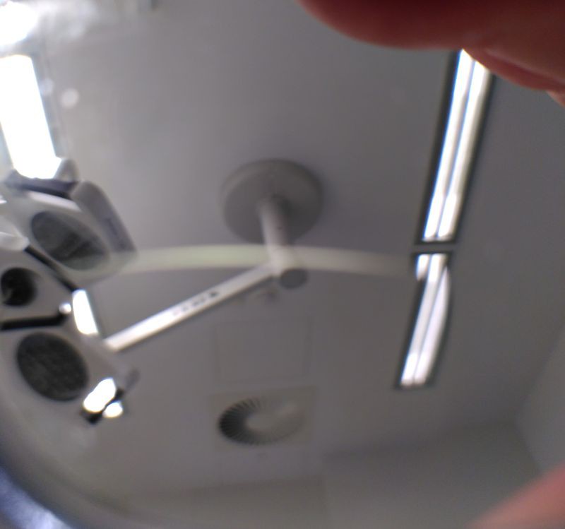While in the emergency room at the local hospital waiting for my broken foot to be examined, I noticed some ethereal green and yellow stripes across my vision. The stripes went away when people walked by my feet. A little moving my head around and blocking light sources with my hands showed that the stripes were caused by a light on the wall at the foot end of the examination table: