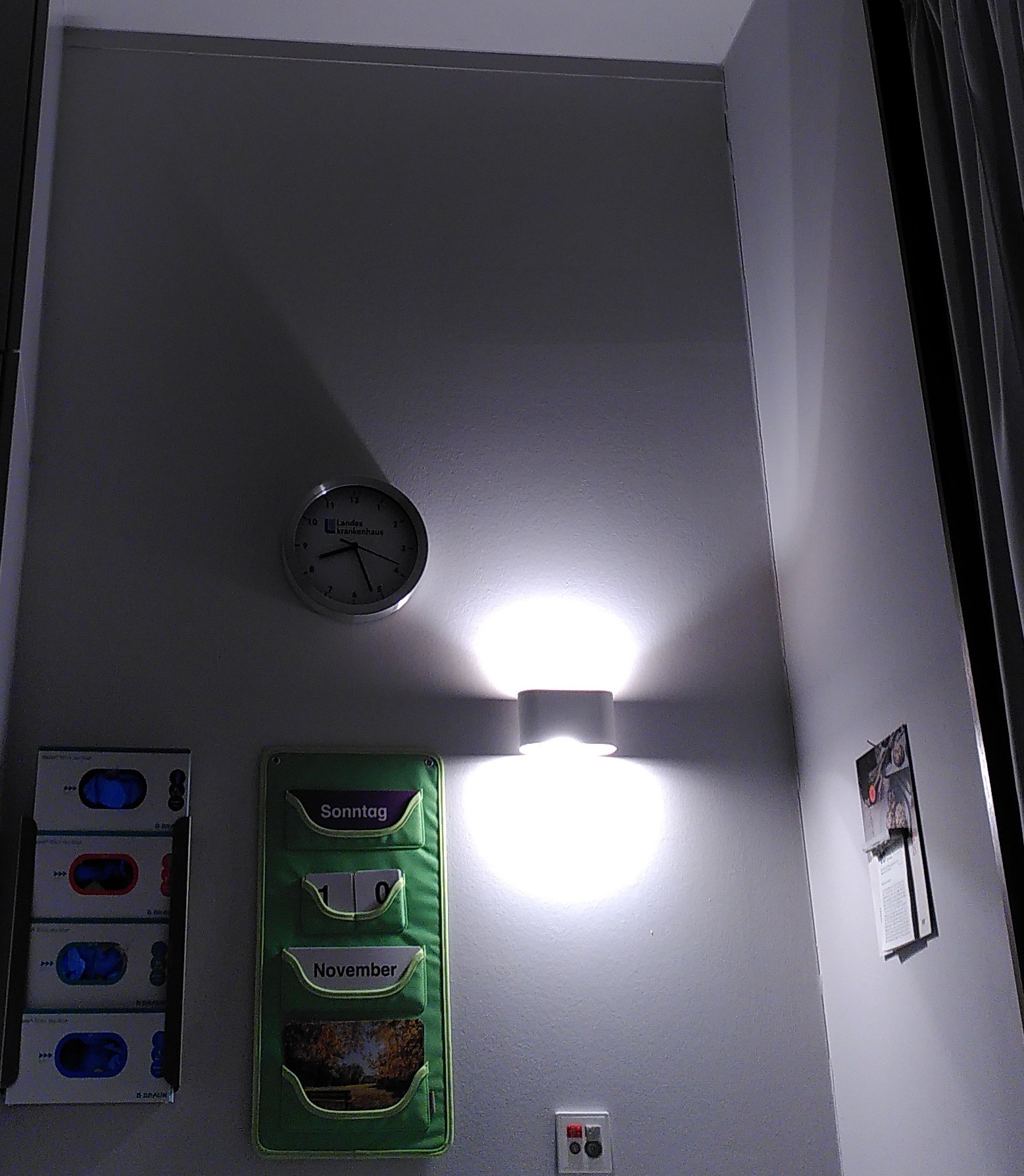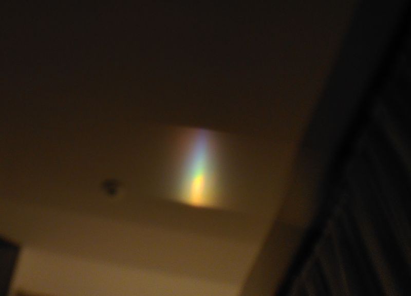 I can't stand progressive lenses, so I have old fashioned lenses with a small field at the bottom for reading. While lieing on my back, looking up at the ceiling, the hard transition from the normal lens to the bifocal lens was in the correct position to play prism for the light on the wall.