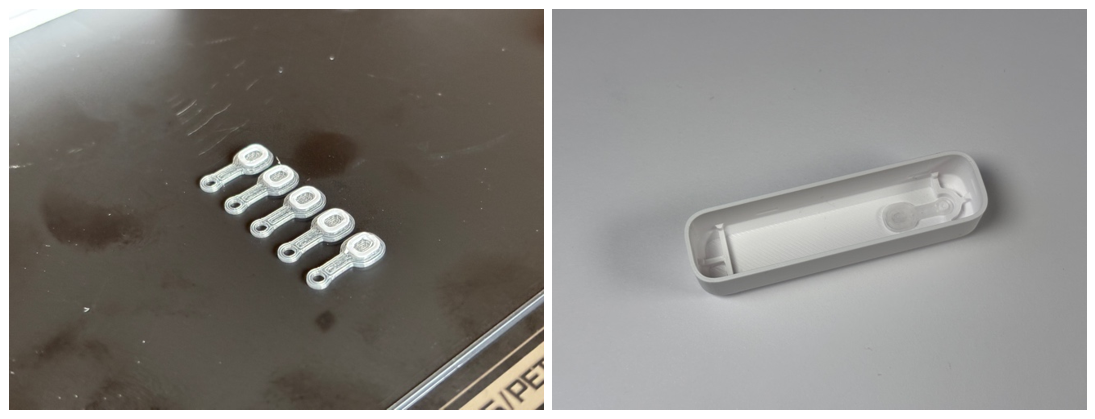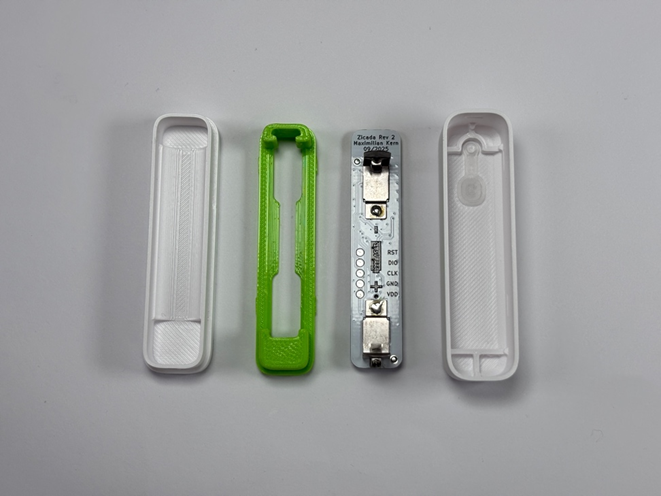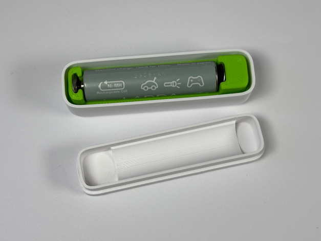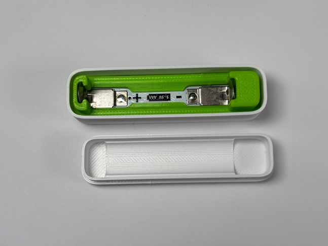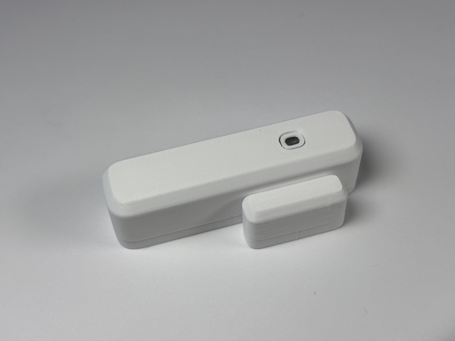 The case mainly consists of two snap-fit shells that can be opened to replace the battery. Inside the front shell, there is another 3D-printed piece for holding the PCB in place and guiding the battery to its contacts. This inlay piece is also essential to ensure that the AAA cell can only be inserted the correct way. This is achieved by recessing the positive terminal slightly. Zigbee Devices require some mechanism to start the pairing process, so there is a hole in the case for a pushbutton. This button is attached to the case via a small hinge. By changing the filament mid-print, the button gains a transparent window to the status led beneath it.