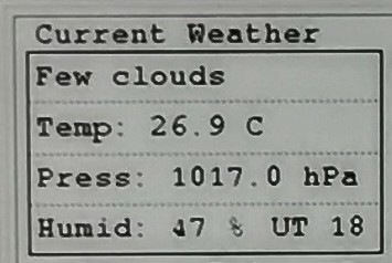 - In the upper left part of the screen there is the basic information about the current weather. In the first line we have descriptive information about the weather condition, then the temperature in degrees Celsius with one decimal place, then the air pressure value and the air humidity expressed in percent. Next we have the label UT (Update time) which tells us at what time the data was last downloaded.