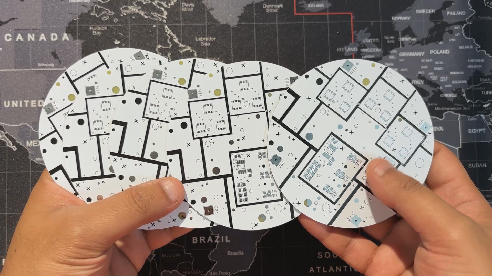 We added a CON1 connector with four pins to access VCC, GND, DIN, and DOUT, giving us complete support for daisy-chaining multiple Giant Neopixels if needed. To protect the LEDs and regulate brightness, we also placed current-limiting resistors between VCC and the anodes of the RGB LEDs.