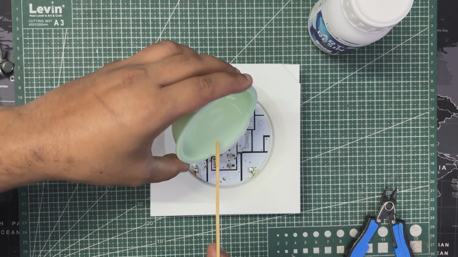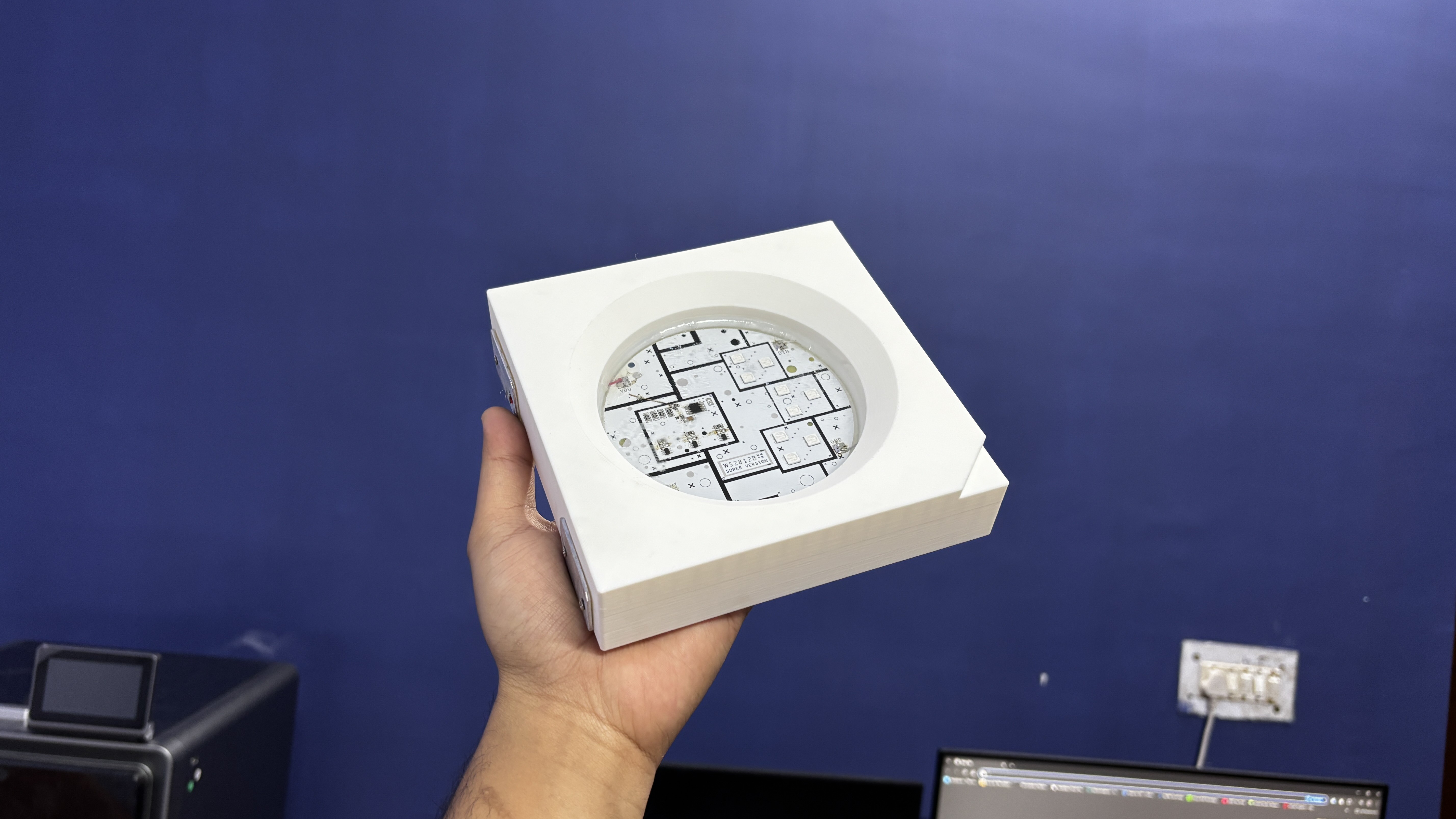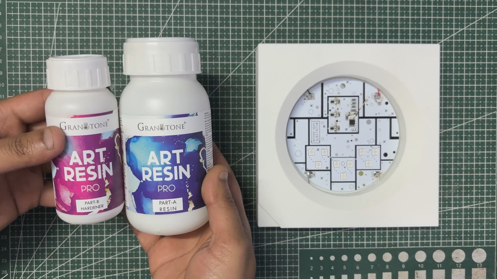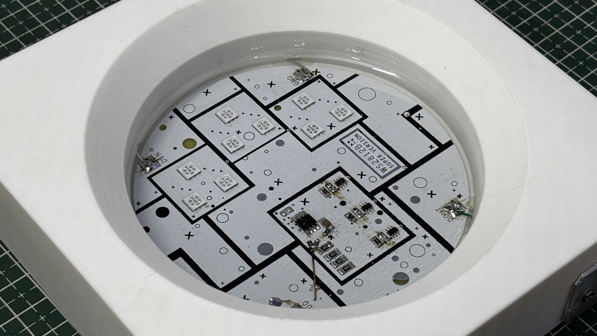 After preparing the enclosure, we mixed the epoxy in the required 2:1 ratio and poured the entire mixture into the middle cavity. We let it cure for about 12 hours, and once hardened, it formed a solid, glass-like protective layer that not only looks great but also encapsulates all the electronics—just like the epoxy-filled 5050 package of a real WS2812B LED.