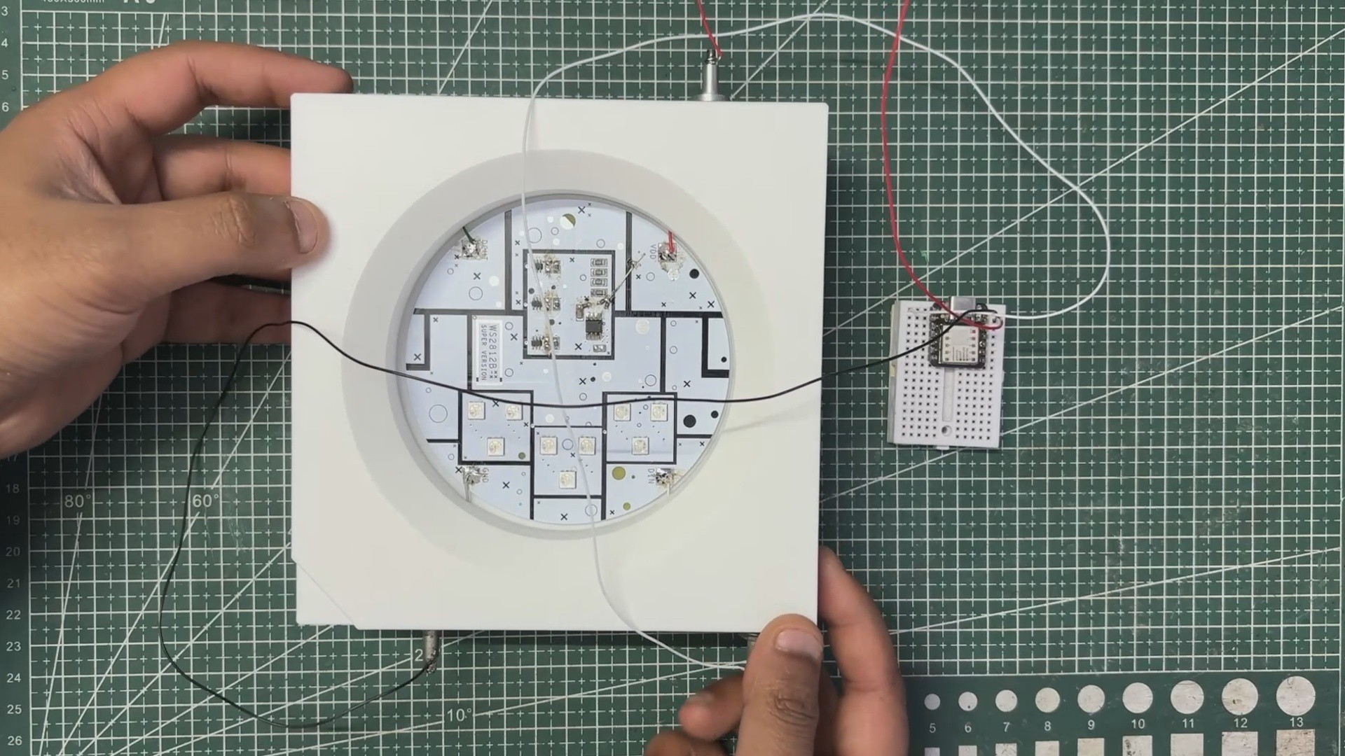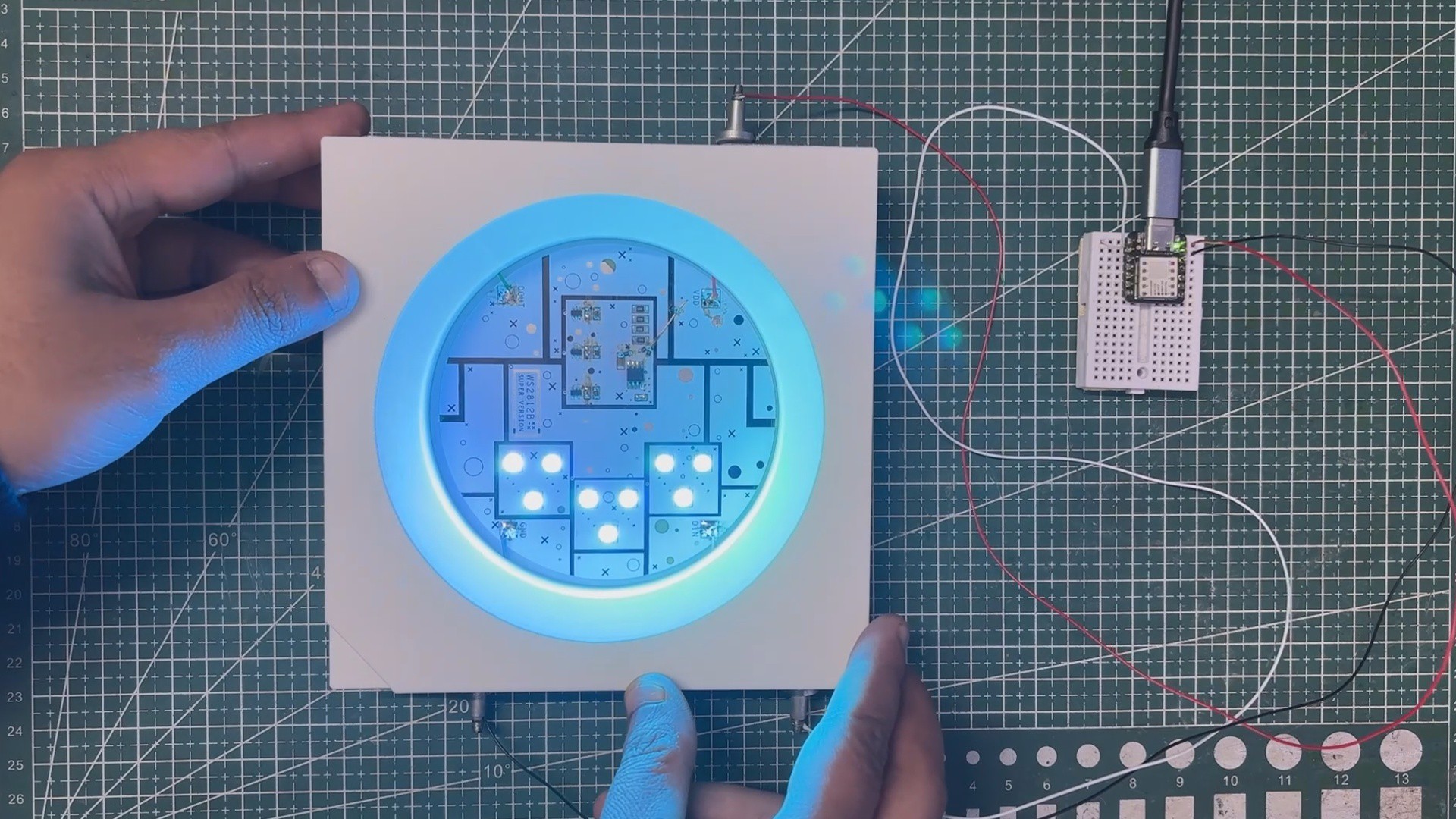 We connected wires to the magnetic holders and paired them with the power lines from our XIAO board: 5V to VCC, GND to GND, and DIN to GPIO0. The circuit worked properly, confirming that everything was connected correctly.