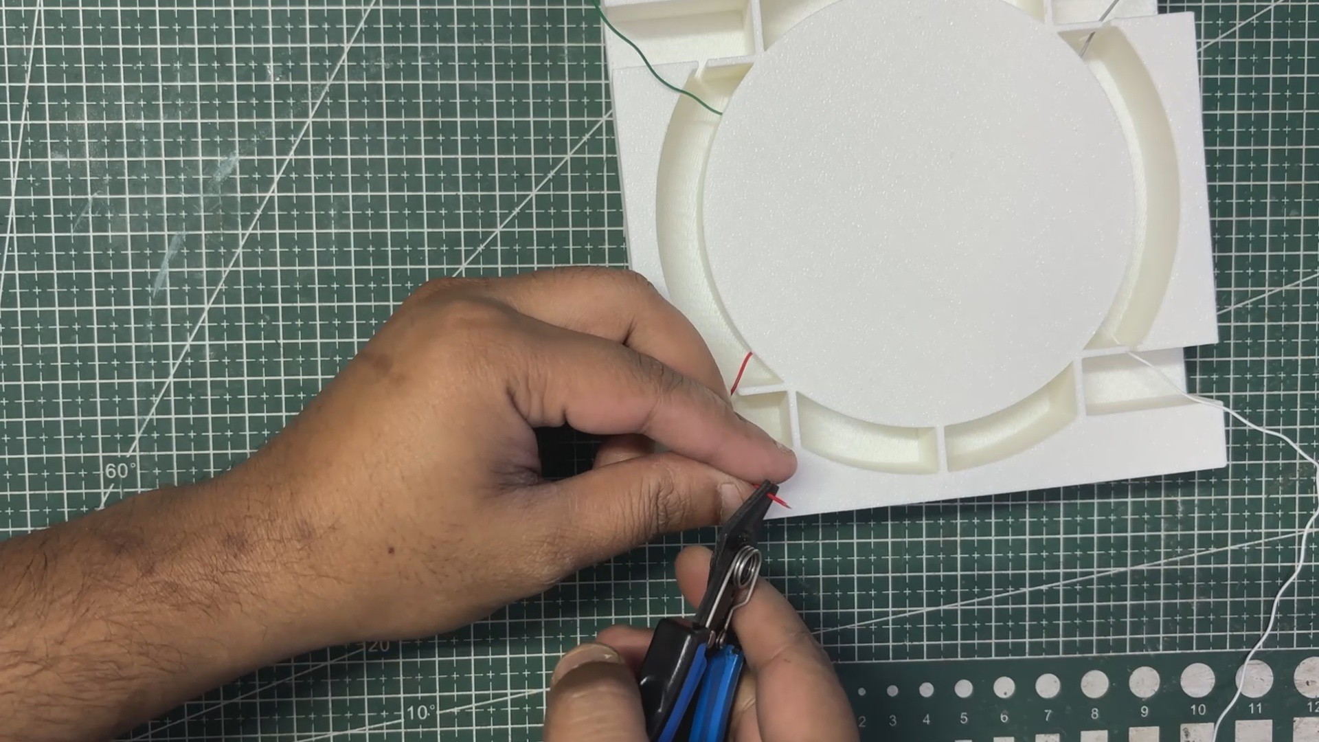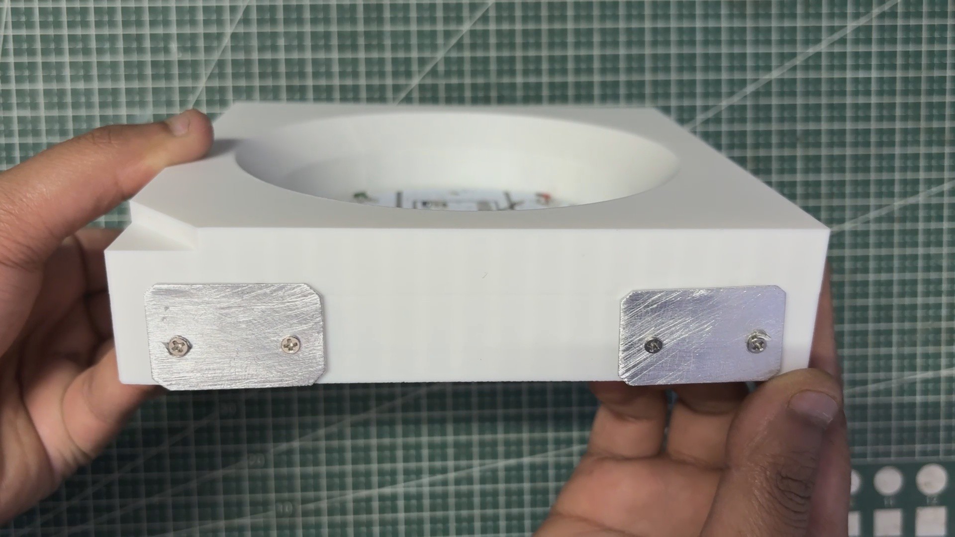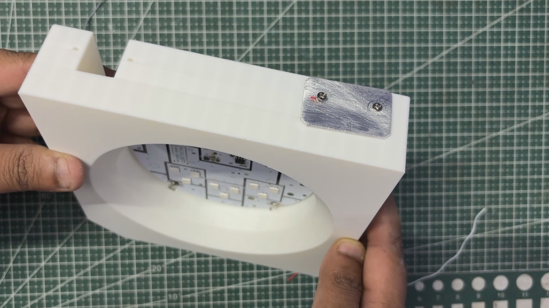 - All the wires attached to the circuit are routed through the four openings provided in the middle area. These openings allow the wires to pass from the front side to the back side, where they will later be connected to the aluminum terminals.