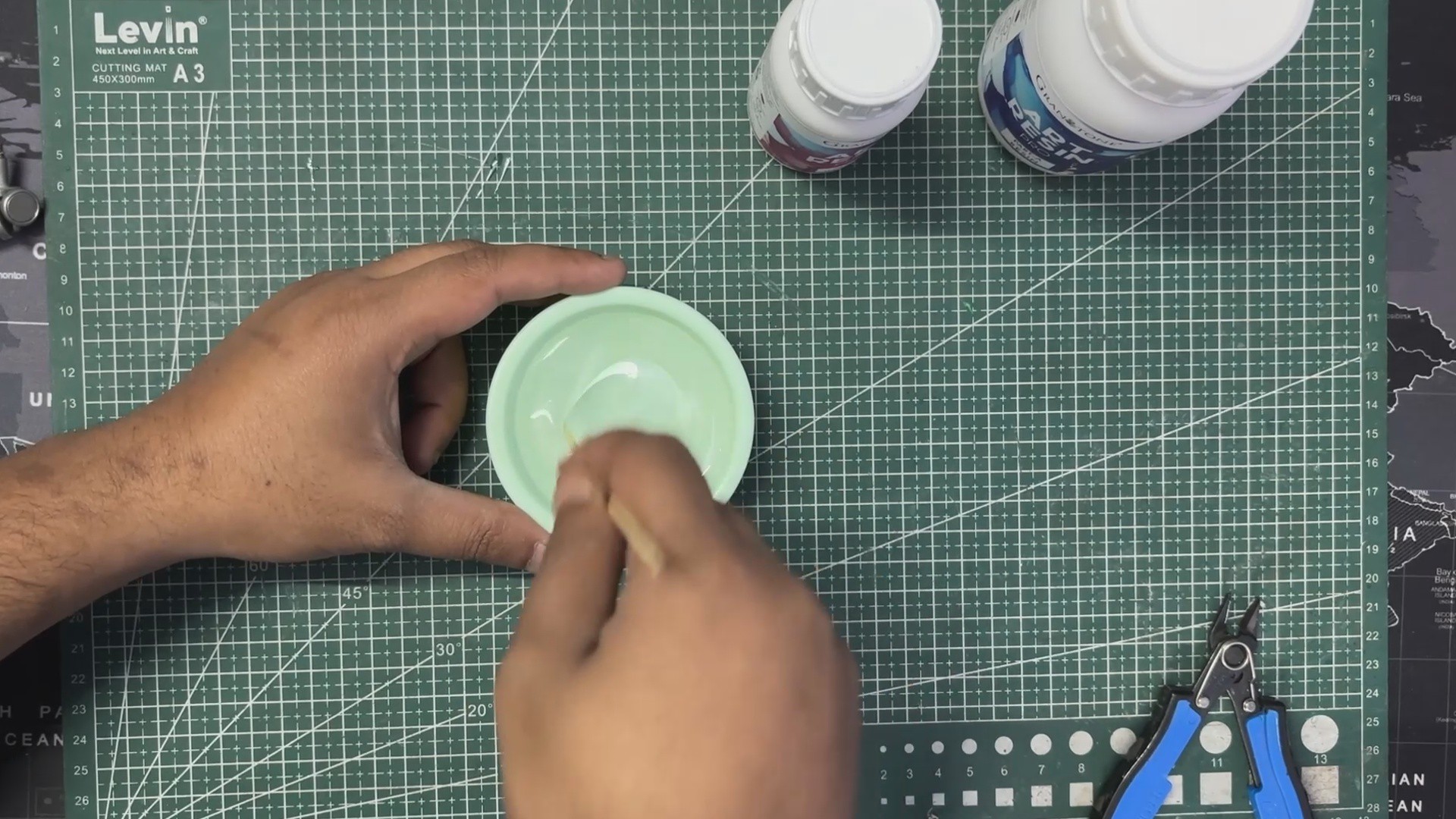 To encase the electronics, our plan was to use clear epoxy, and for this we purchased a 2:1 epoxy kit. Inside the circular section of the body, we had four holes for wire routing. If we poured epoxy directly, it would simply leak out of these openings, so we sealed them with hot glue first.