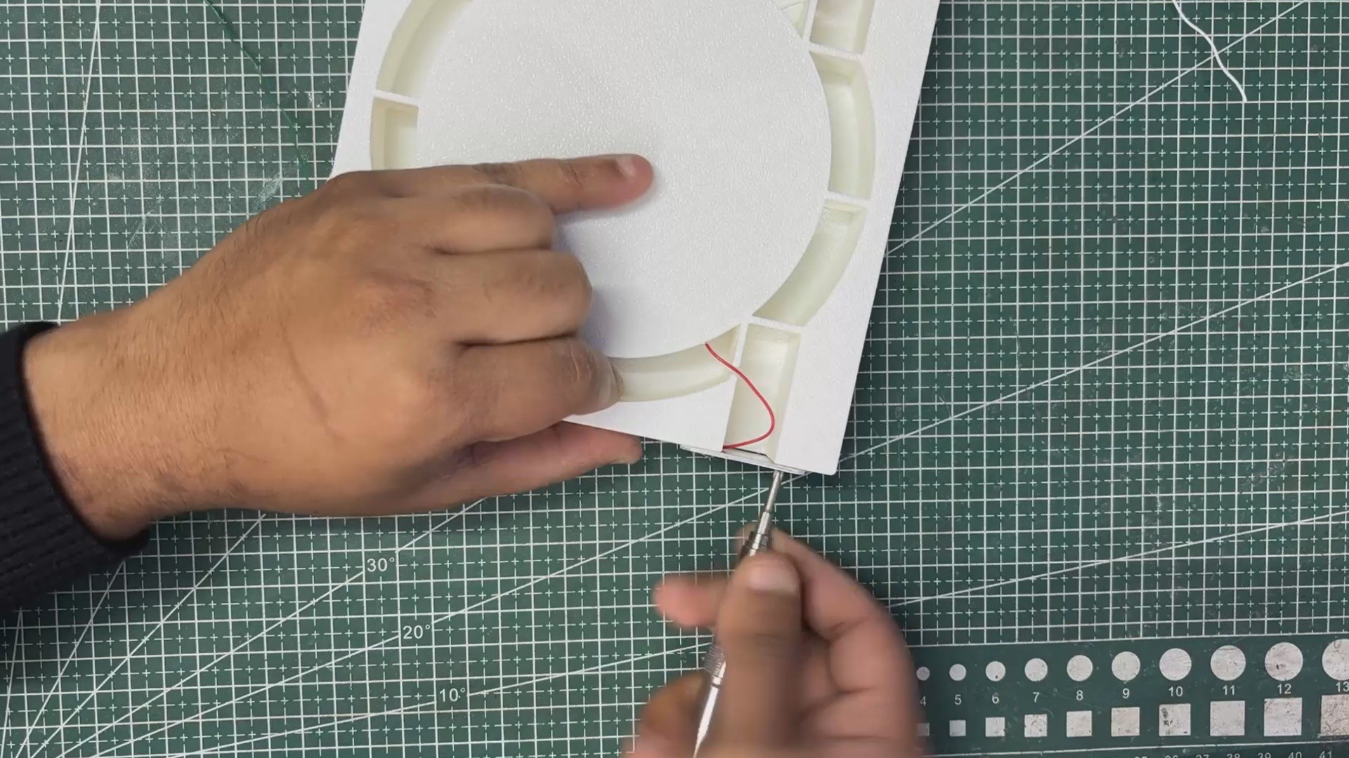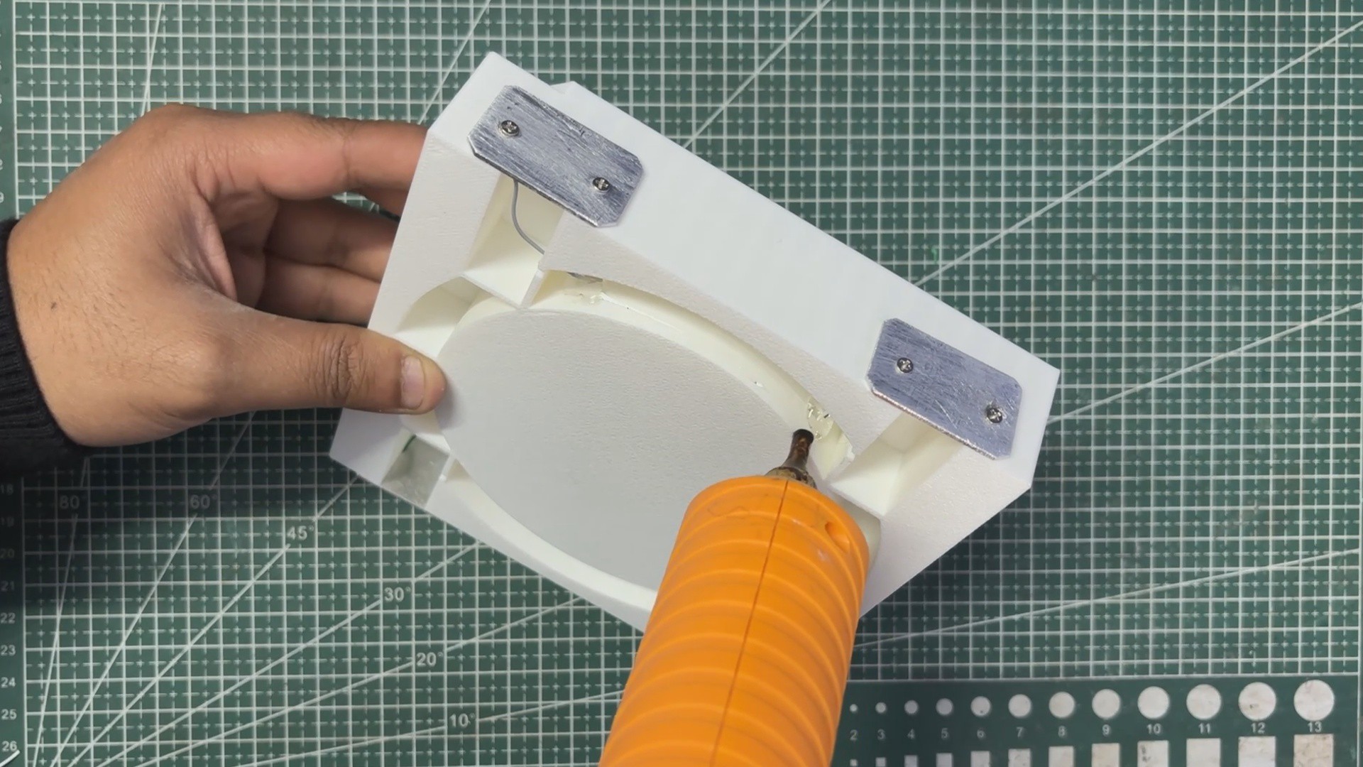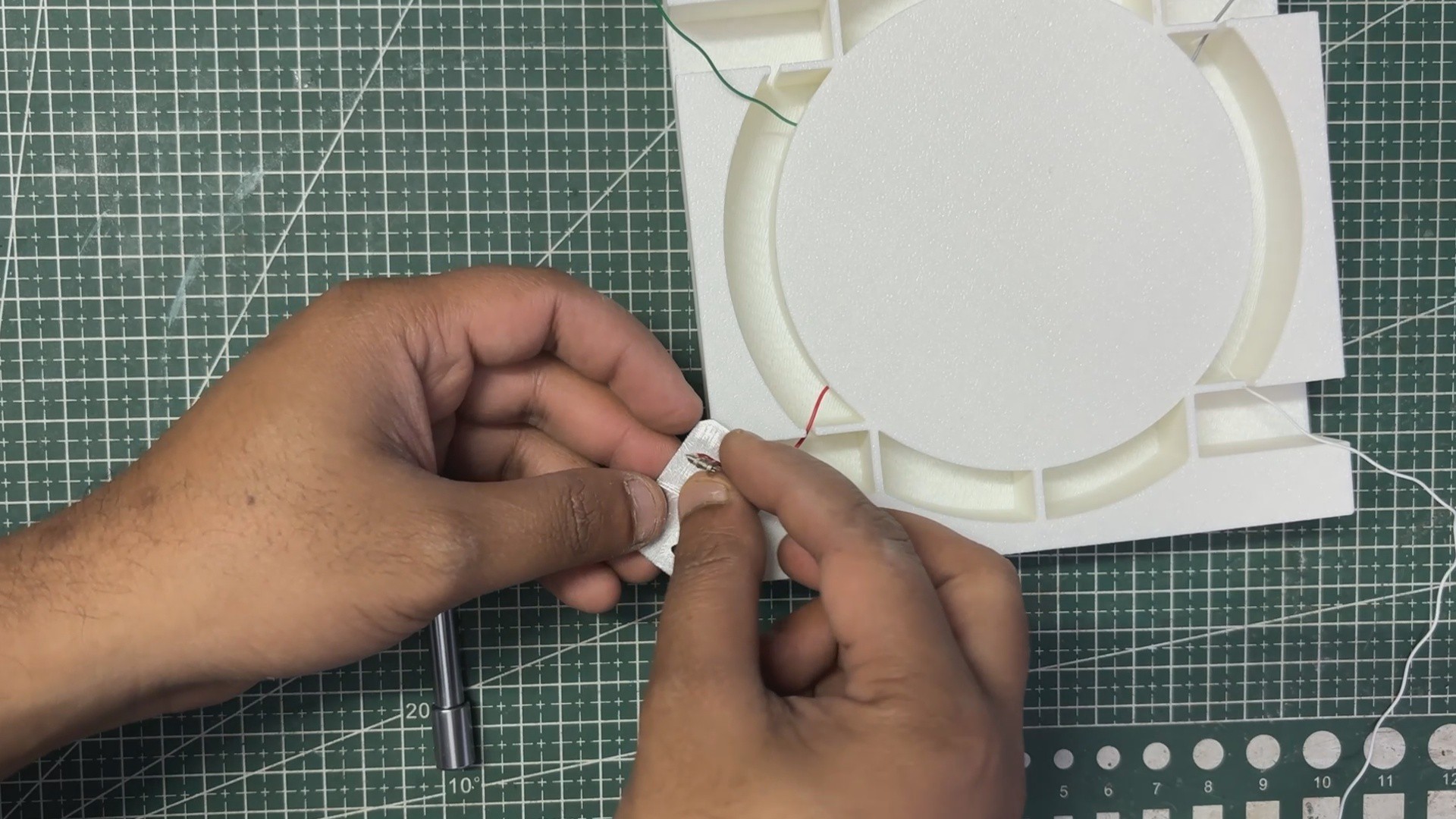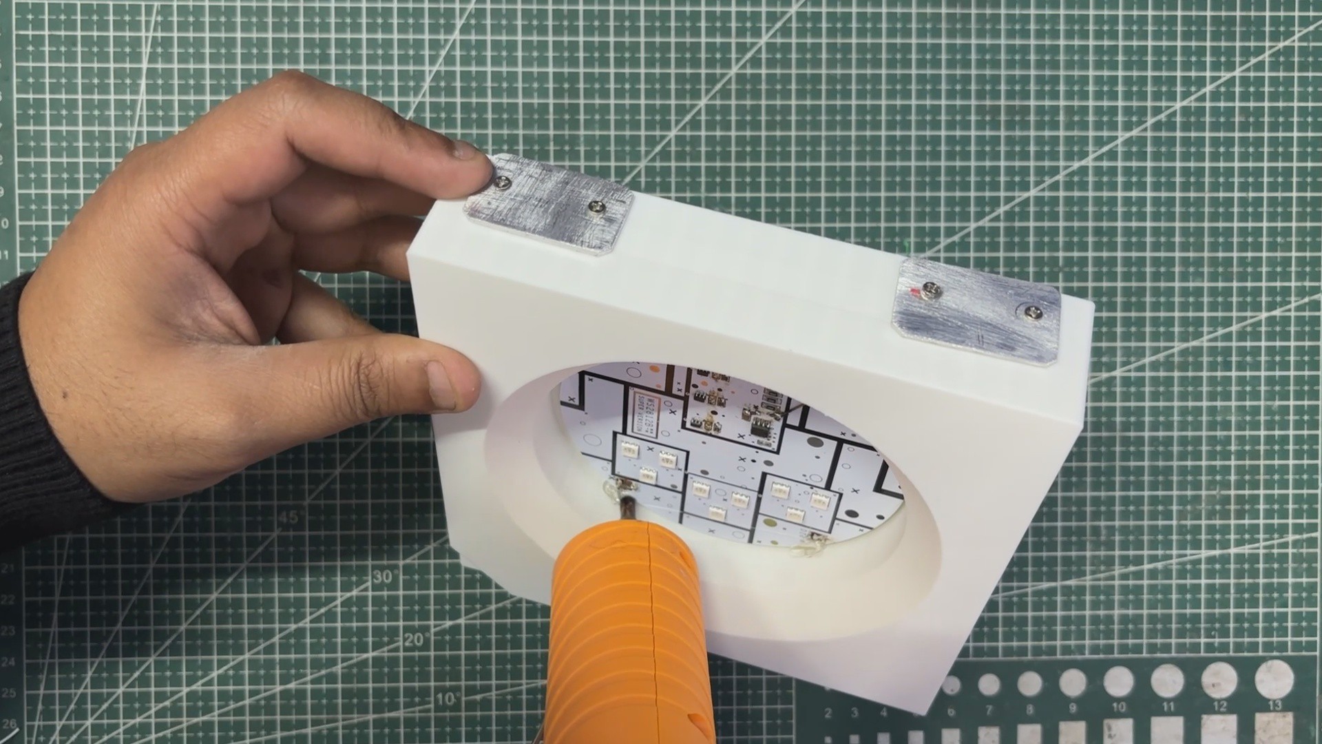 - Next, we applied double-sided thermal tape to the back of the circuit and press-fit the circuit into the center section of the main body.