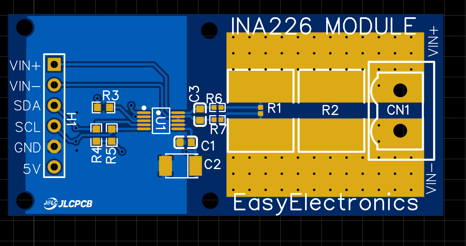 If standard breakout boards limit your project (due to overheating or fixed addresses), building a custom PCB is the next logical step. Below, we analyze the EasyElectronics INA226 Module. This design is a perfect example of how to bridge the gap between a "theoretical" schematic and a "production-grade" hardware solution.