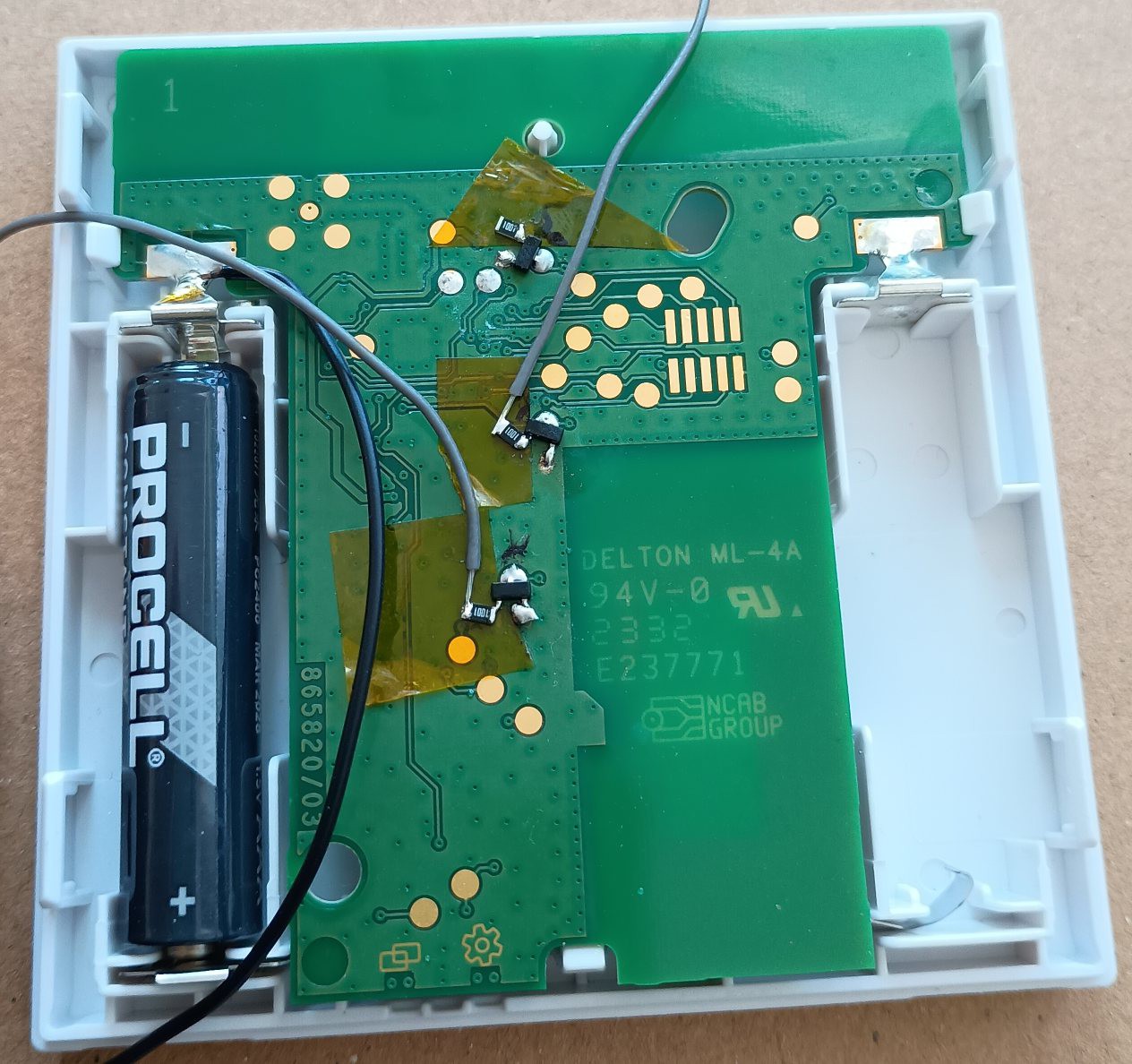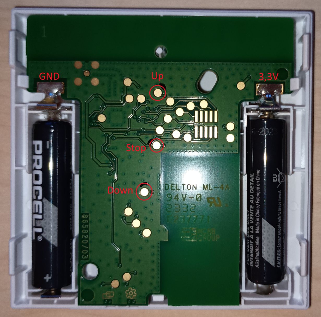 First of all you have to open the back cover of the remote control and as next step the additional cover with the nameplate. Now you have the back side of the PCB in front of you with all the test-points. You can now also remove the PCB, but that's not needed! All you need are the test-points which directly connect to the buttons. The following picture shows you the relevant test points: