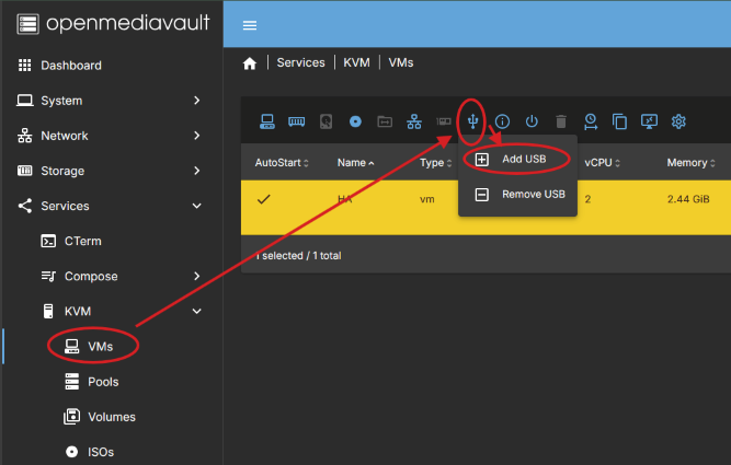 Now we must prepare the other side, the Homa Assistant system. First if you use Homa Assistant in a VM check that the USB device with the virtual com port to the Arduino is passed through to your VM. In OMV it looks like this:Now check if the device is available in Home Assistant by going to the settings -> system -> hardware -> all hardware (Hint: Advanced Mode must be enabled in your profile).