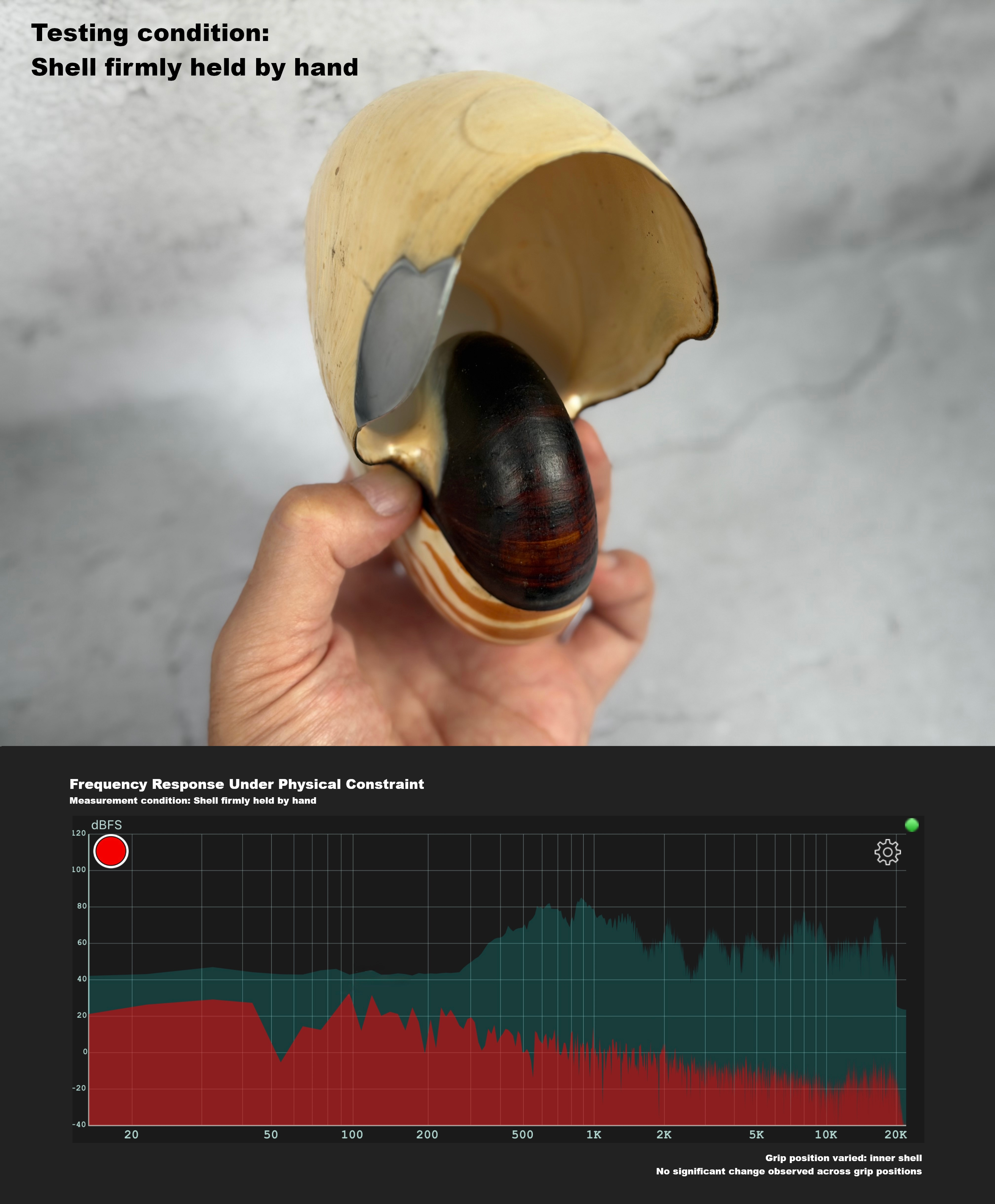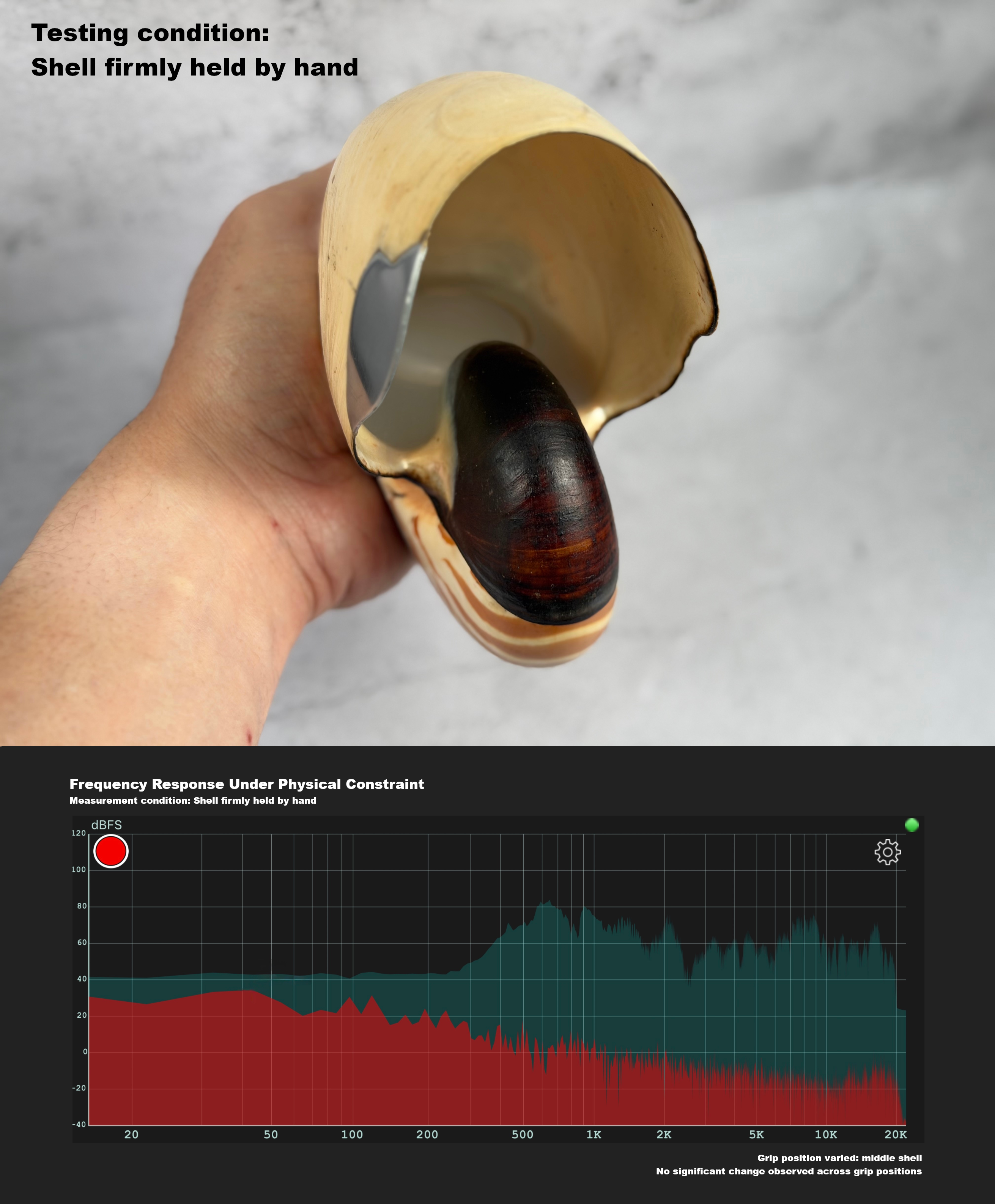 When the shell was held by hand—regardless of where it was touched or gripped (inner whorl, middle region, or outer shell)—there was no clearly audible change in sound pressure, tonal balance, or perceived vibration intensity.