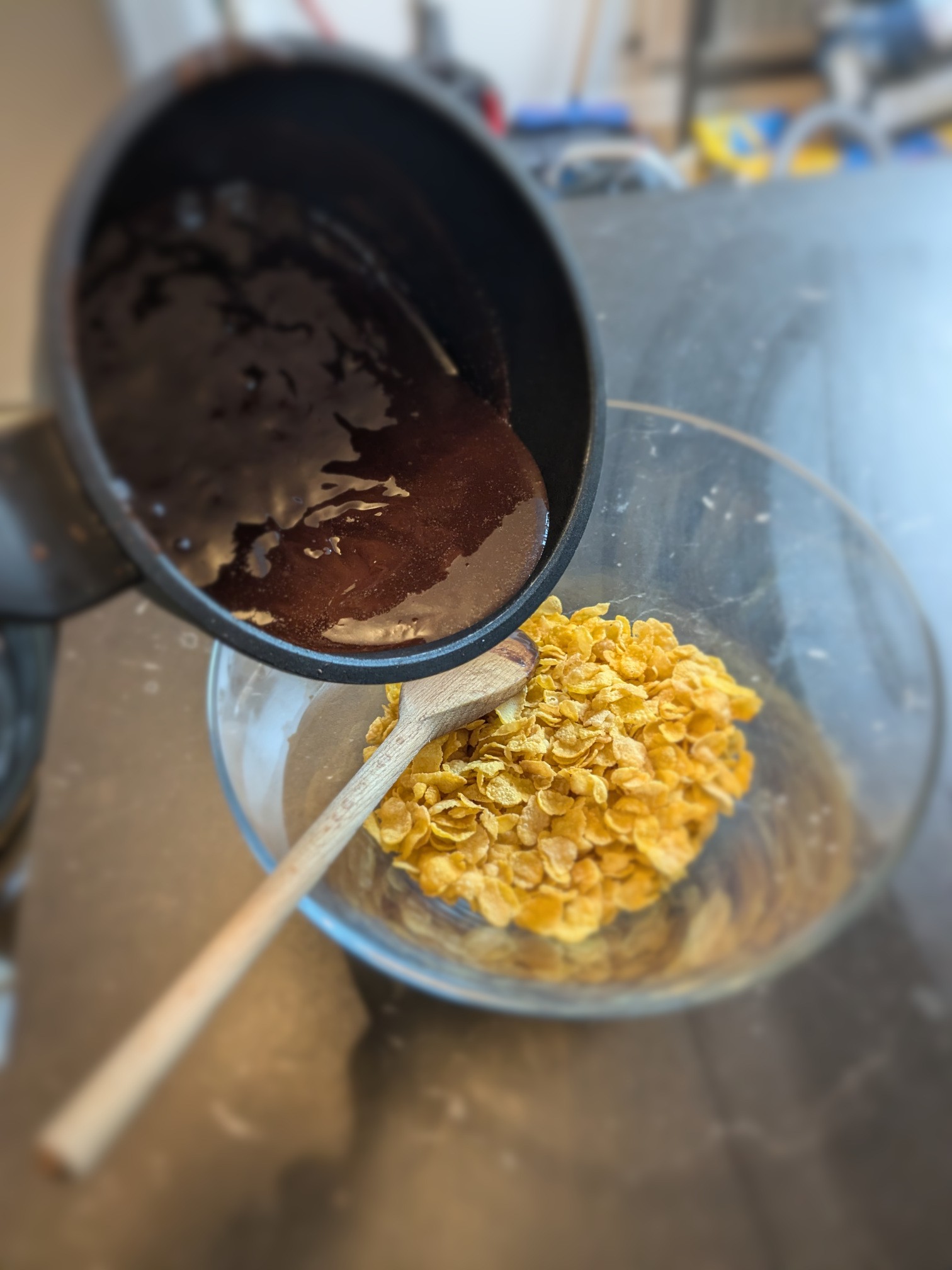 melt the chocolate and the butter, and then add the corn flakes.
