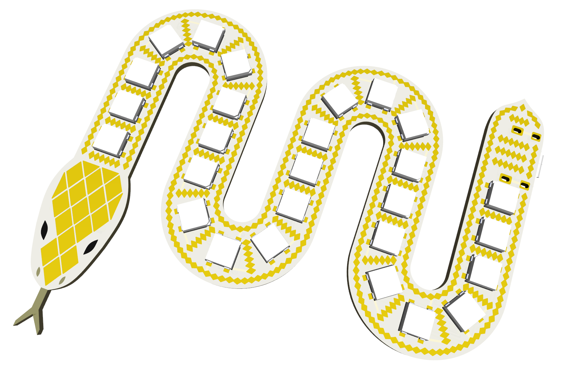 A rectangular PCB to represent a linear tape was the obvious choice but a rectangle isn’t a very interesting shape. So I twisted the tape into more of an S-shape. It was starting to look a bit snake-like which suggested adding a head and tail and then to decorate the surface with scales to represent the skin. With an ENIG gold finish the result was quite visually appealing in KiCad’s 3D render.