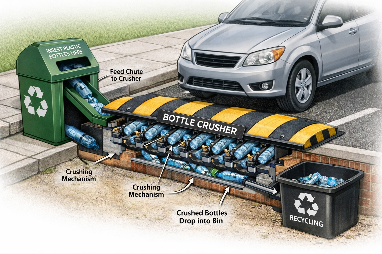 Integrating a vehicle activated bottle crusher into urban speed breakers can realistically achieve up to approximately 70–80% volume reduction of empty PET bottles when proper venting and compression geometry are incorporated. This substantial compaction at the point of disposal directly supports sustainable city objectives by decreasing waste storage requirements, reducing collection frequency and lowering transportation emissions associated with hauling low density plastic waste. By embedding passive mechanical recycling into existing road infrastructure, municipalities can improve material recovery efficiency without additional energy consumption, electrical infrastructure or dedicated land use. The result is a decentralized, low-maintenance waste minimization system that enhances urban cleanliness, optimizes logistics efficiency and contributes to circular economy goals within dense city environments.