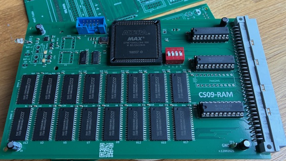 I focused on using only 5V logic but avoided the usual forest of TTL chips and a PAL/GAL solution for the glue logic. Instead I used two 5V CPLD devices which are fast, cheap and can hold a lot of logic allowing one to add some nice features to the system such as fast memory to memory DMA but also esoteric ones like a hardware CRC calculation of OS9 modules. In the File Section I have placed Python code that highlights how to create the CRC calculation in hardware. I used it during testing of the Verilog code. With in-circuit (re)programming system development & testing is quick without having to remove devices from the PCB.