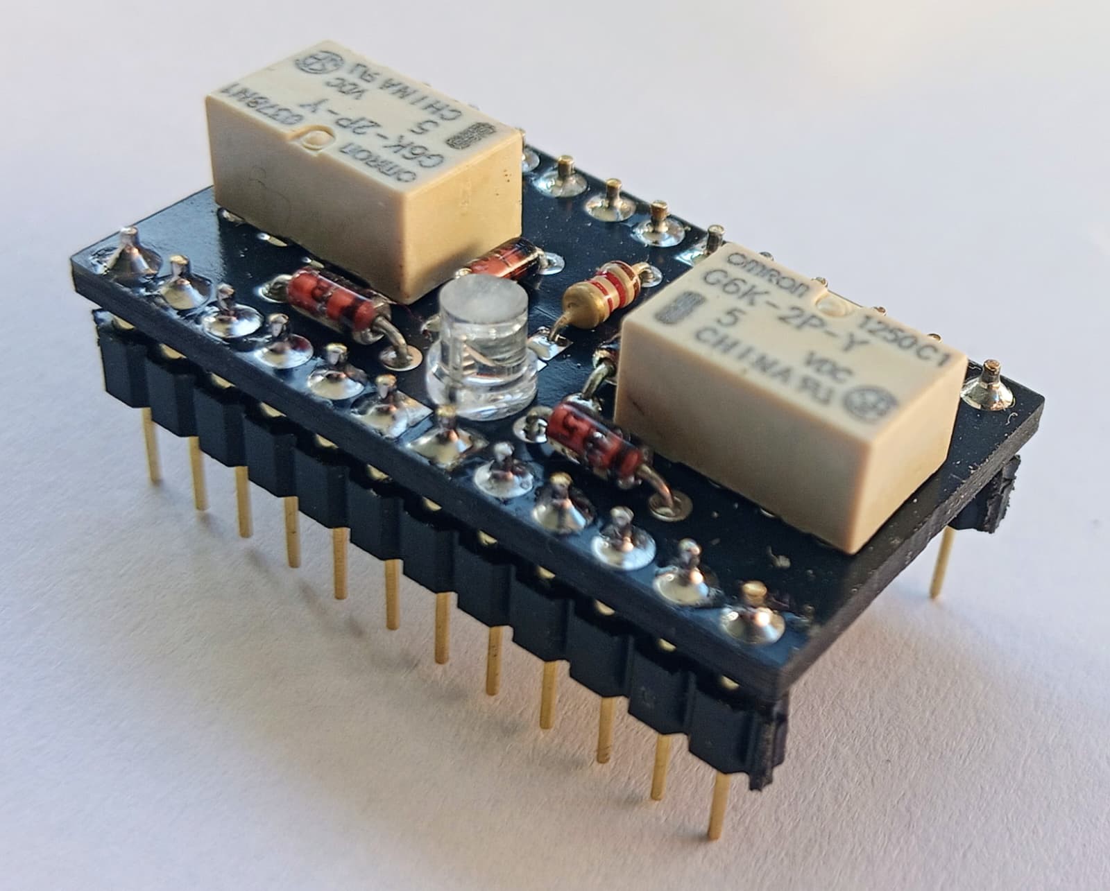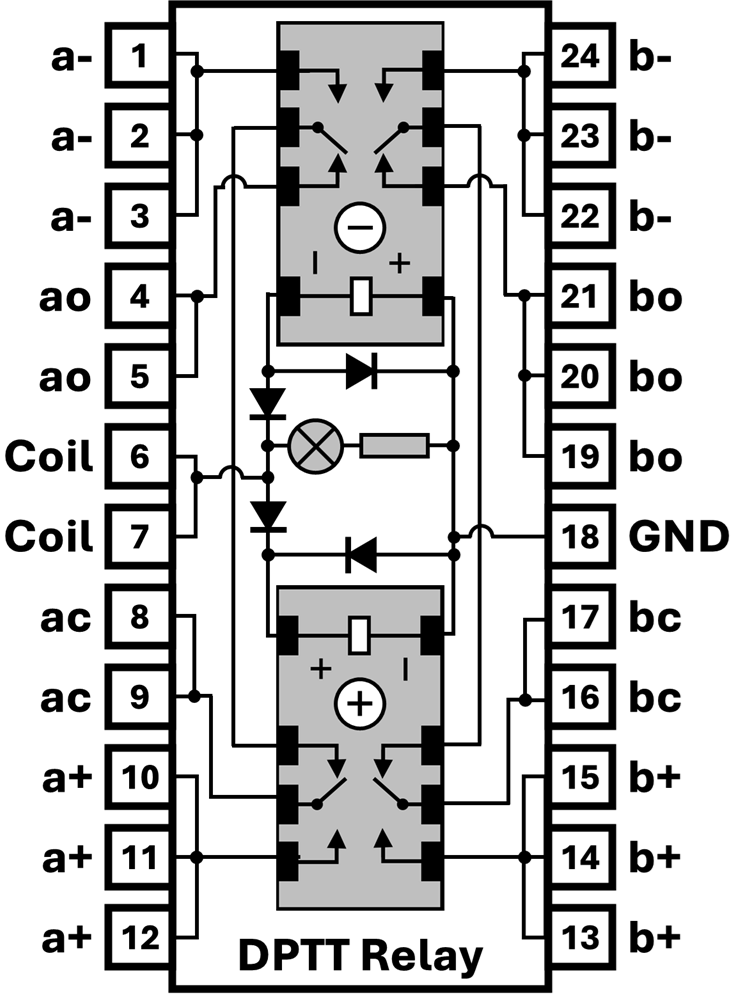 This Double‑Pole Triple‑Throw (DPTT) relay is synthesized from two sub‑miniature G6K‑2F‑Y SPDT relays, packaged in a wide 24‑pin DIP configuration. When neither coil is energized, the common pin floats, representing the o (open) state. Energizing the first coil connects the common to −5 V, representing −. Energizing the second coil connects it to +5 V, representing +. Diodes ensure that only the appropriate relay is driven.