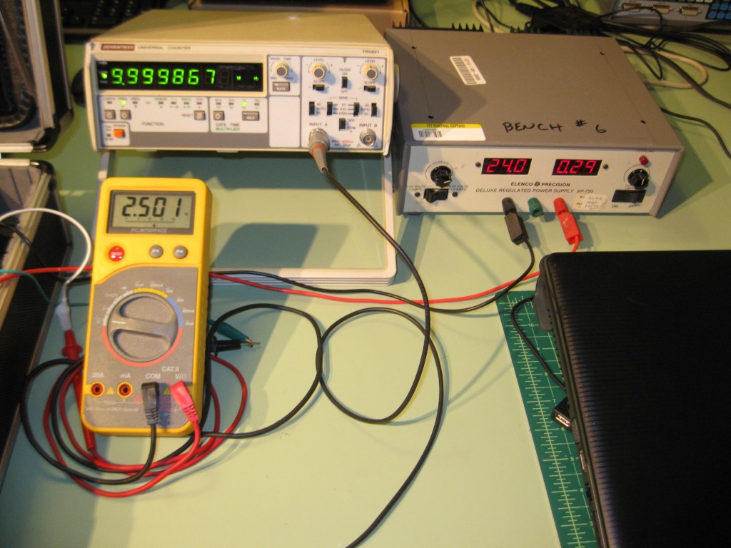 Upon applying 24 volts, the oscillator began operation and Pin 3 showed 5.12V. So far so good; the pot dividing the pin 3 voltage was adjusted to put 2.5V to the EFC pin and the oven was left to settle. About five minutes in, the frequency began to drop very quickly and I discovered that the EFC voltage had inexplicably dropped to 200mV in an instant. Pin 3 measured <0.5V at this time. Hmmm…
