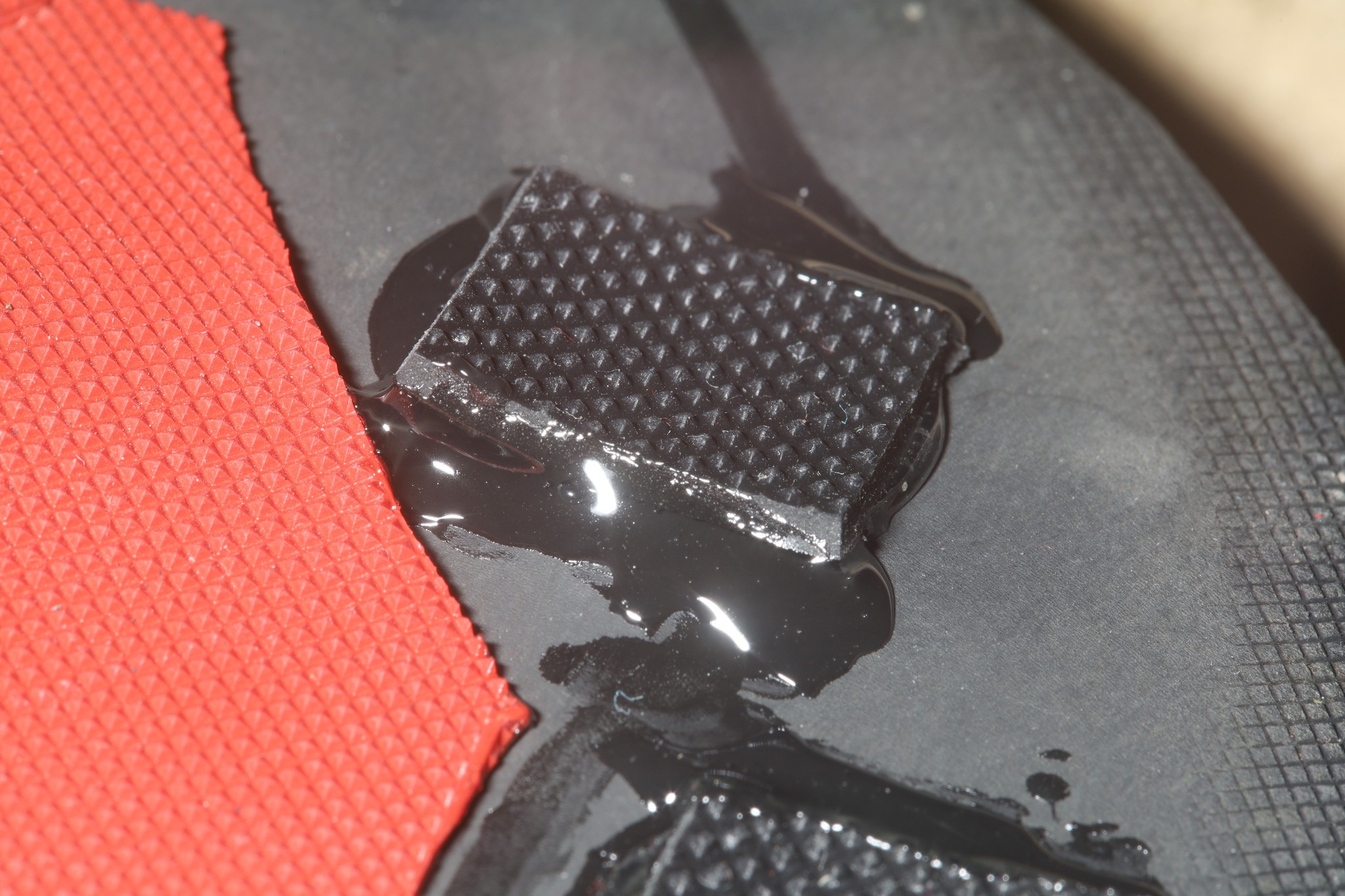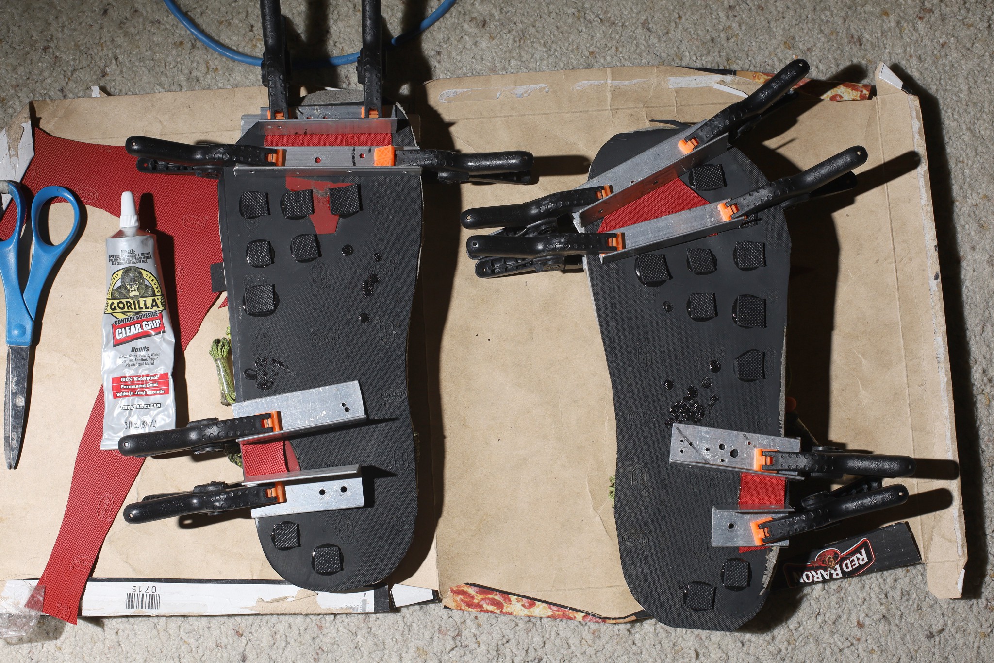 E-6000 adhesive. With the upper suede coating, it's taking 1 tube per sandal.